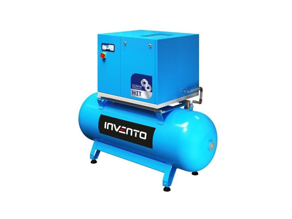 Šroubový kompresor značky Invento, model HT510, výkon 750 l/min, nádrž 270 litrů, tlak 10 bar, výkon 5,5 kW.