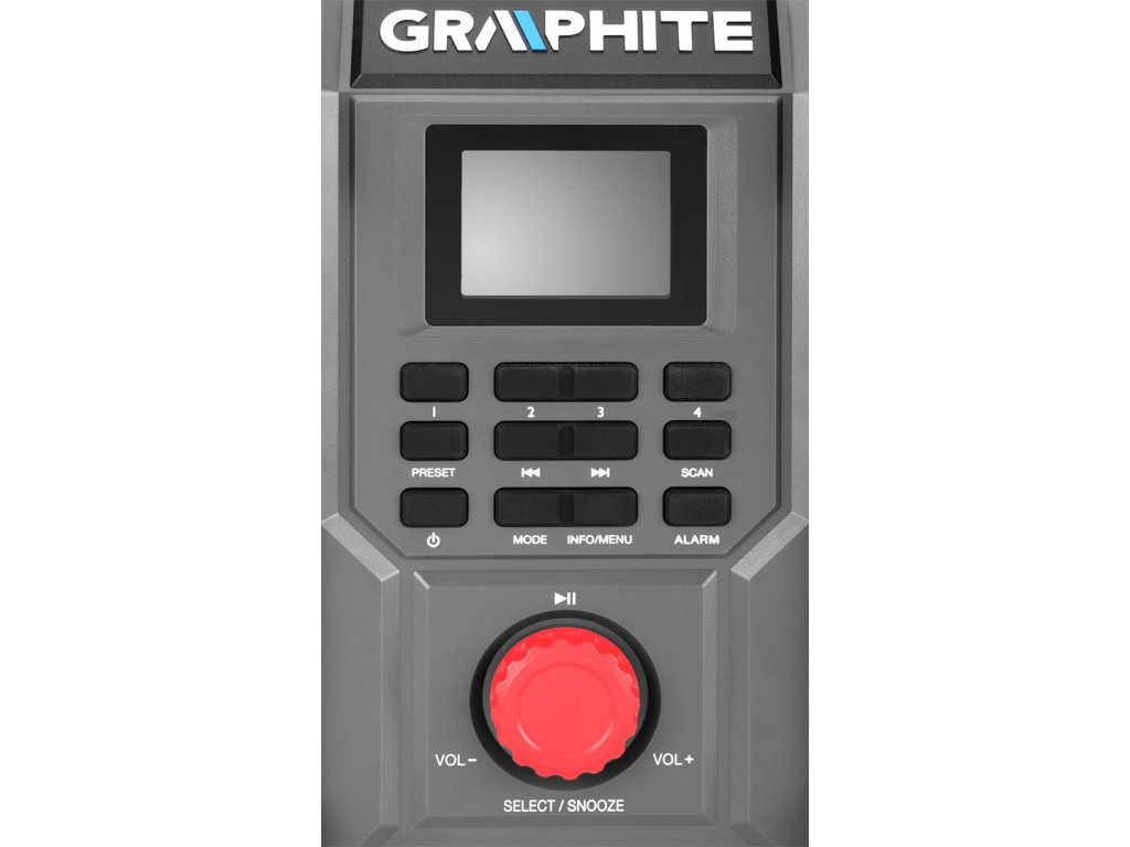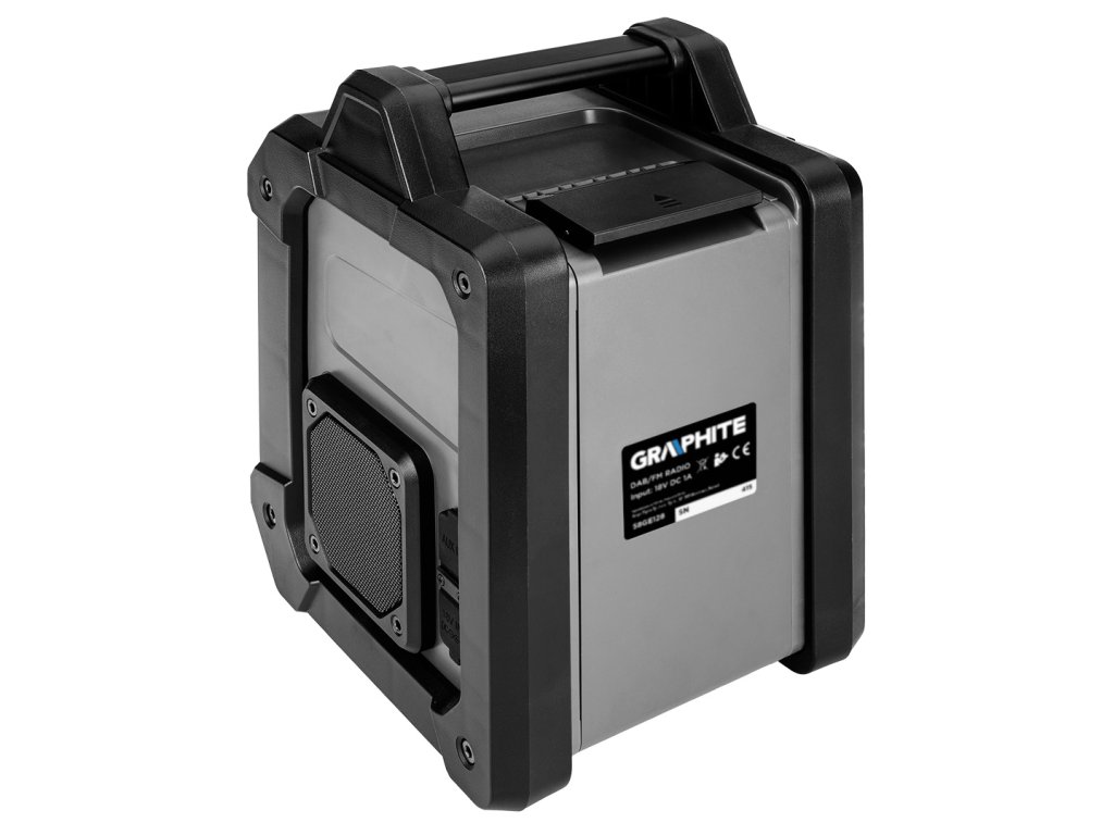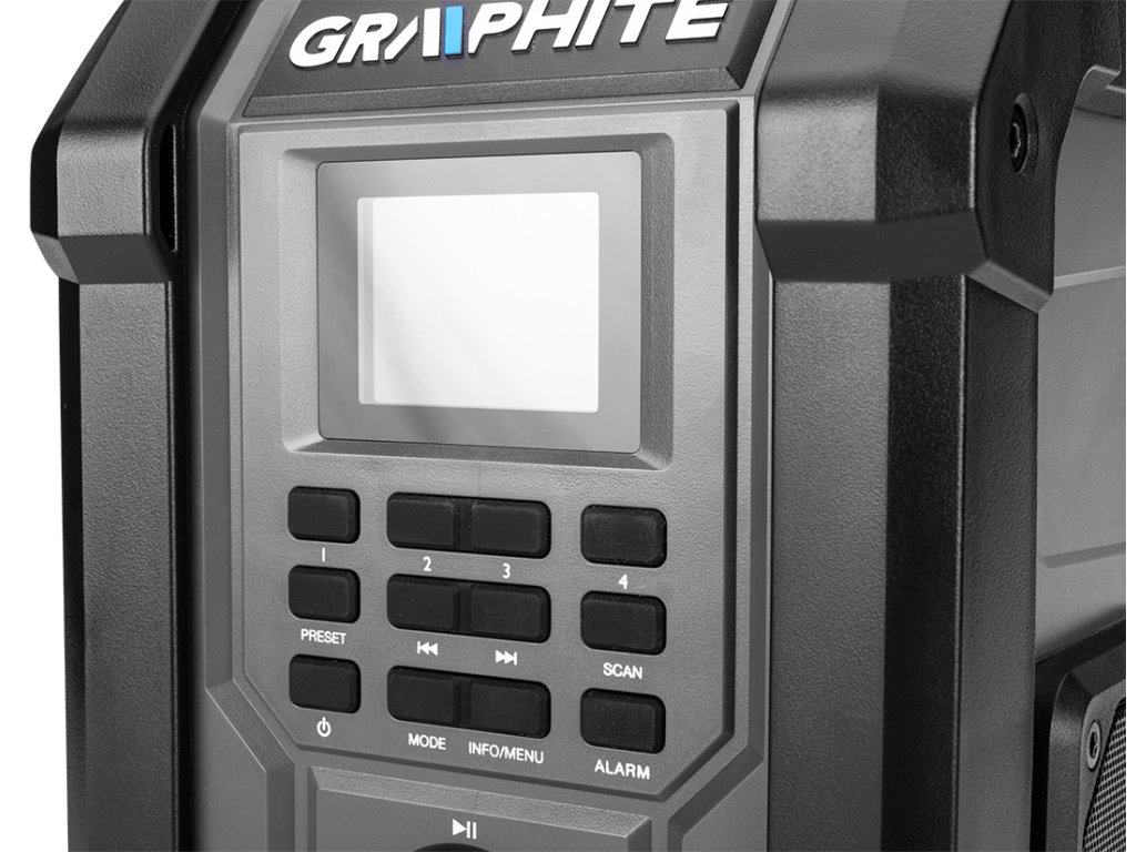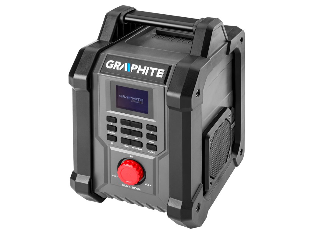 Bezdrátové/síťové rádio Energy+ 18 V od společnosti GRAPHITE 58GE128 je bezdrátové/síťové rádio se 2 výkonnými 15 W reproduktory a zásuvkami USB a AUX. Funguje na 18 V lithium-iontovou baterii systému Energy+ i po připojení do elektrické sítě. Rádio podporuje 30 stanic Fm (87,5 – 108 mHZ), 30 stanic DAB (174 – 240 mHz) a Bluetooth 5.0. Je vybaveno funkcí spánku, budíkem a hodinami s automatickým nastavením, což výrazně zvyšuje jeho komfort. Přístroj má také 2,4palcový barevný displej s možnostmi nastavení jasu a stmívání pro snadnou změnu nastavení. Na druhé straně držák telefonu v krytu umožňuje pohodlné připojení k rádiu. Skvěle se hodí k použití na stavbě, v dílně nebo v servisu.