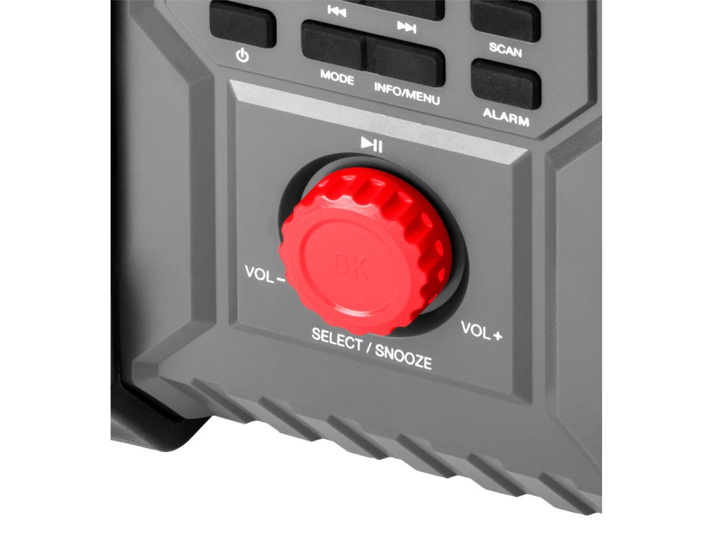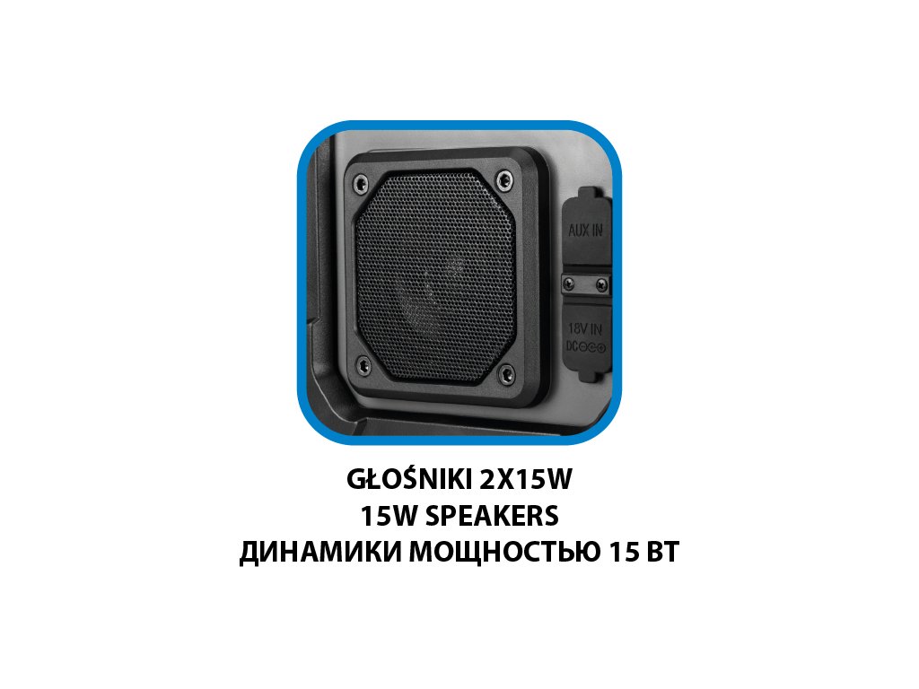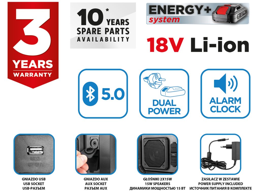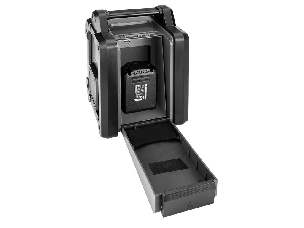Bezdrátové/síťové rádio Energy+ 18 V od společnosti GRAPHITE 58GE128 je bezdrátové/síťové rádio se 2 výkonnými 15 W reproduktory a zásuvkami USB a AUX. Funguje na 18 V lithium-iontovou baterii systému Energy+ i po připojení do elektrické sítě. Rádio podporuje 30 stanic Fm (87,5 – 108 mHZ), 30 stanic DAB (174 – 240 mHz) a Bluetooth 5.0. Je vybaveno funkcí spánku, budíkem a hodinami s automatickým nastavením, což výrazně zvyšuje jeho komfort. Přístroj má také 2,4palcový barevný displej s možnostmi nastavení jasu a stmívání pro snadnou změnu nastavení. Na druhé straně držák telefonu v krytu umožňuje pohodlné připojení k rádiu. Skvěle se hodí k použití na stavbě, v dílně nebo v servisu.