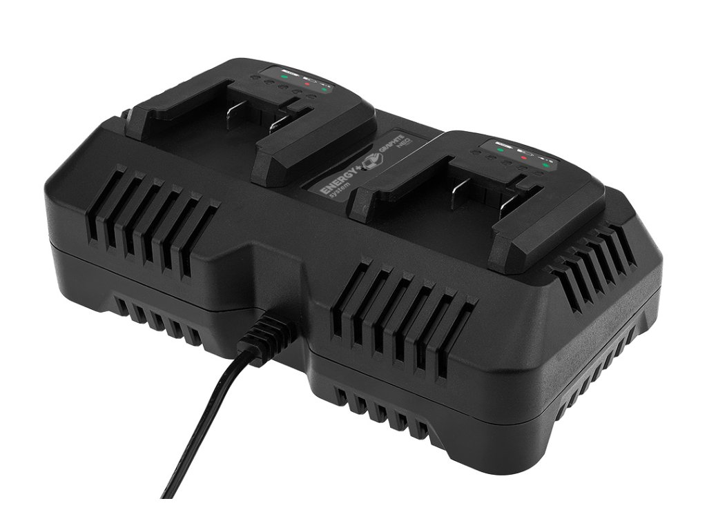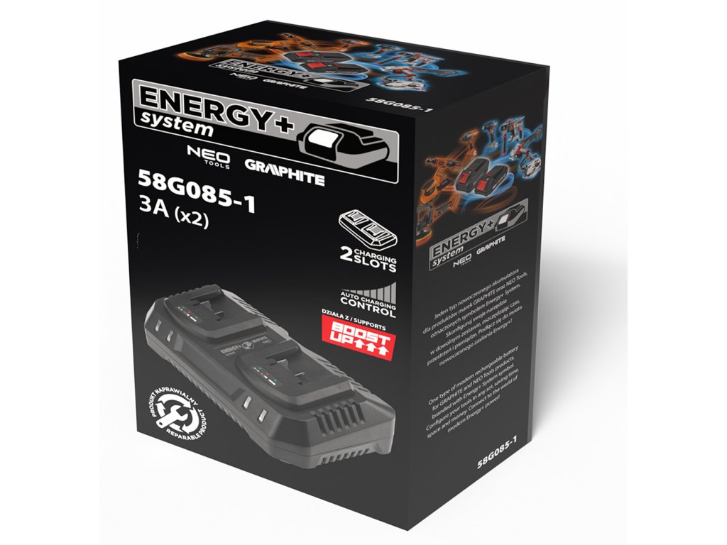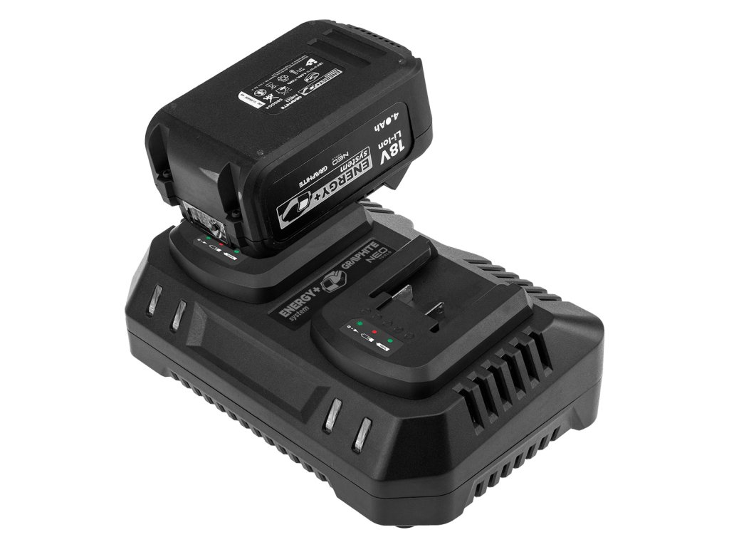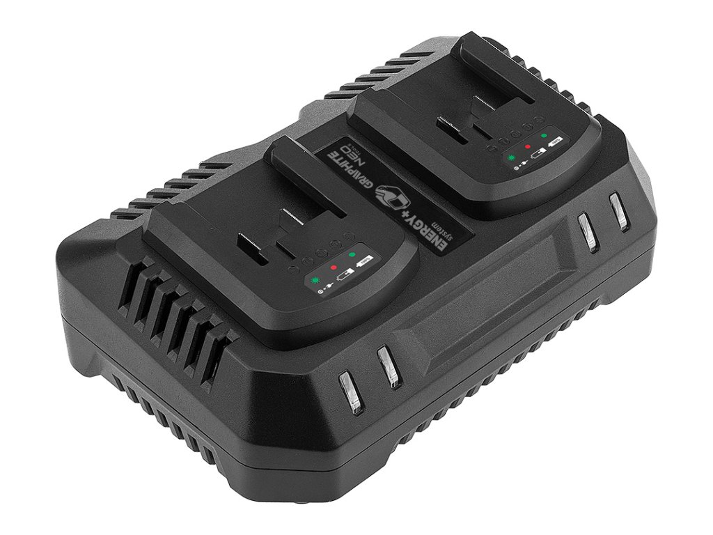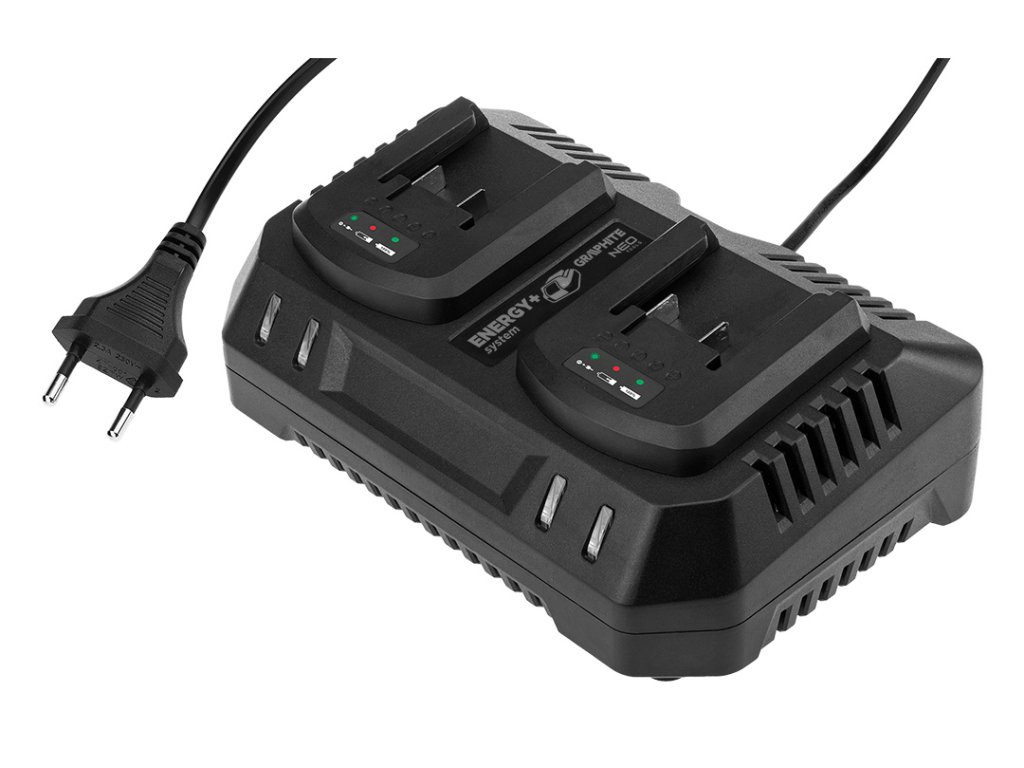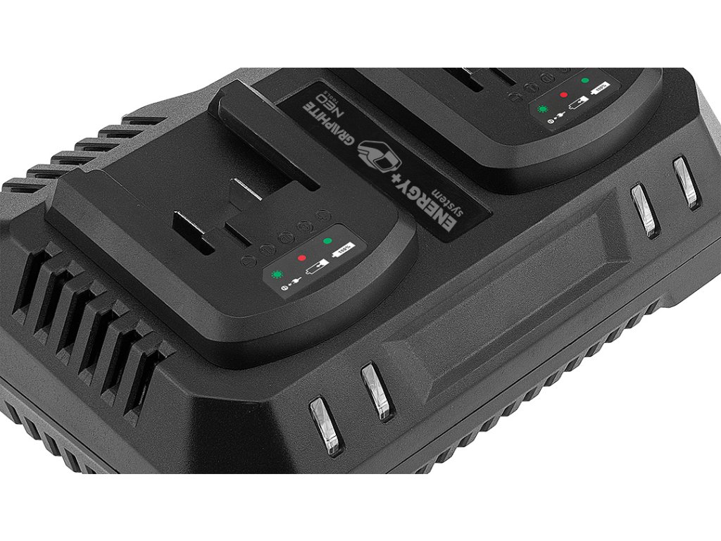 Nabíječka akumulátorů GRAPHITE Energy+ 18V Li-Ion 58G085-1 umožňuje nabíjet dva akumulátory současně. Má maximální nabíjecí proud 2 x 3A, doba nabíjení akumulátoru 58G001 je 45 min, doba nabíjení akumulátoru 58G004 je 90 min a doba nabíjení akumulátoru 58G086 je 135 min. Jasné LED diody indikují připojené napětí, probíhající nabíjení nebo konec nabíjení. Nabíječka GRAPHITE je vybavena systémem kontroly napětí a teploty pro úplnou ochranu baterie a uživatele. Zařízení má flexibilní a robustní napájecí kabel.