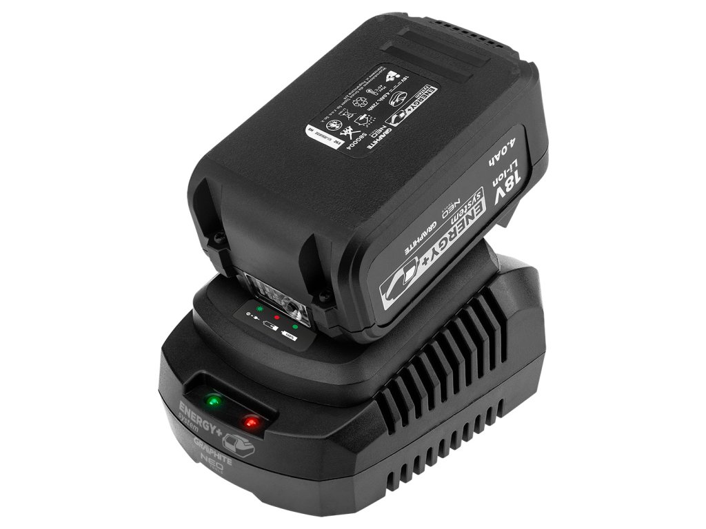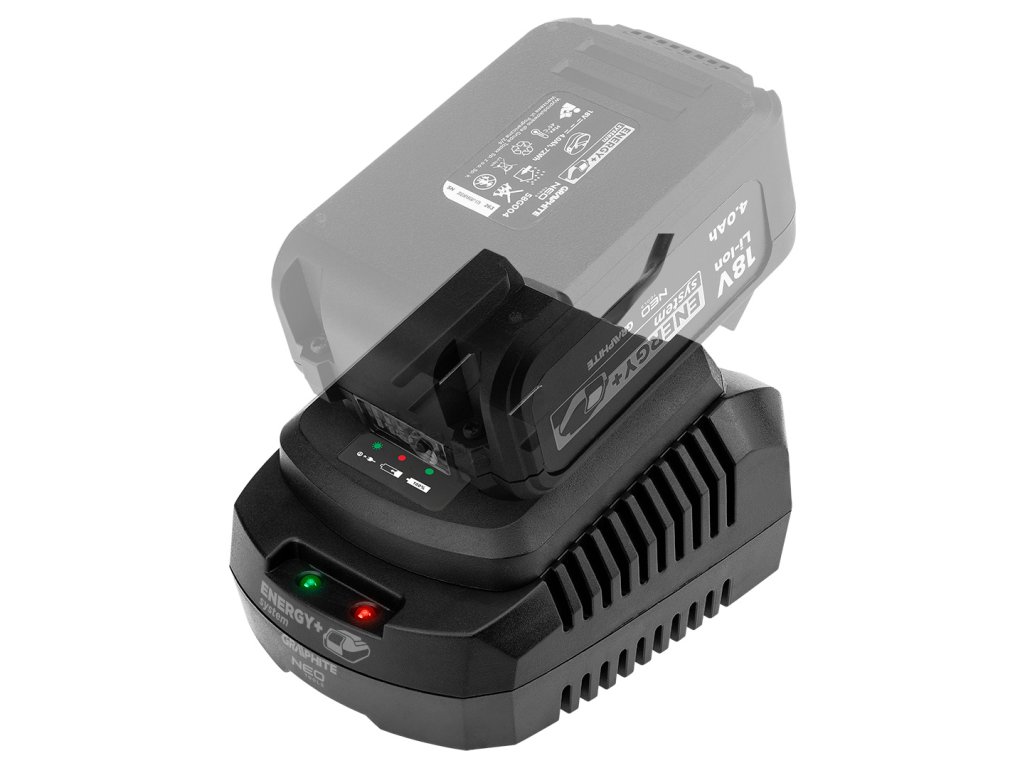 Nabíječka akumulátorů 58G002-1 GRAPHITE Energy+ 18V Li-Ion s maximálním nabíjecím proudem 2,4 A a dobou nabíjení 50 min pro 58G001 a 58G001-1, 100 min pro 58G004 a 58G004-8,5 58G086-1 a 200 min pro 58GE152 8Ah. Snadno čitelná LED indikuje připojené napětí, probíhající nabíjení nebo konec nabíjení. Nabíječka je vybavena systémem kontroly napětí a teploty pro úplnou ochranu baterie a uživatele. Zařízení má flexibilní a robustní napájecí kabel, který se doporučuje i pro profesionální a průmyslové aplikace v interiéru i exteriéru.