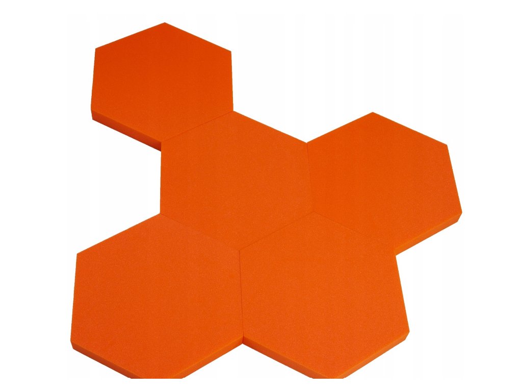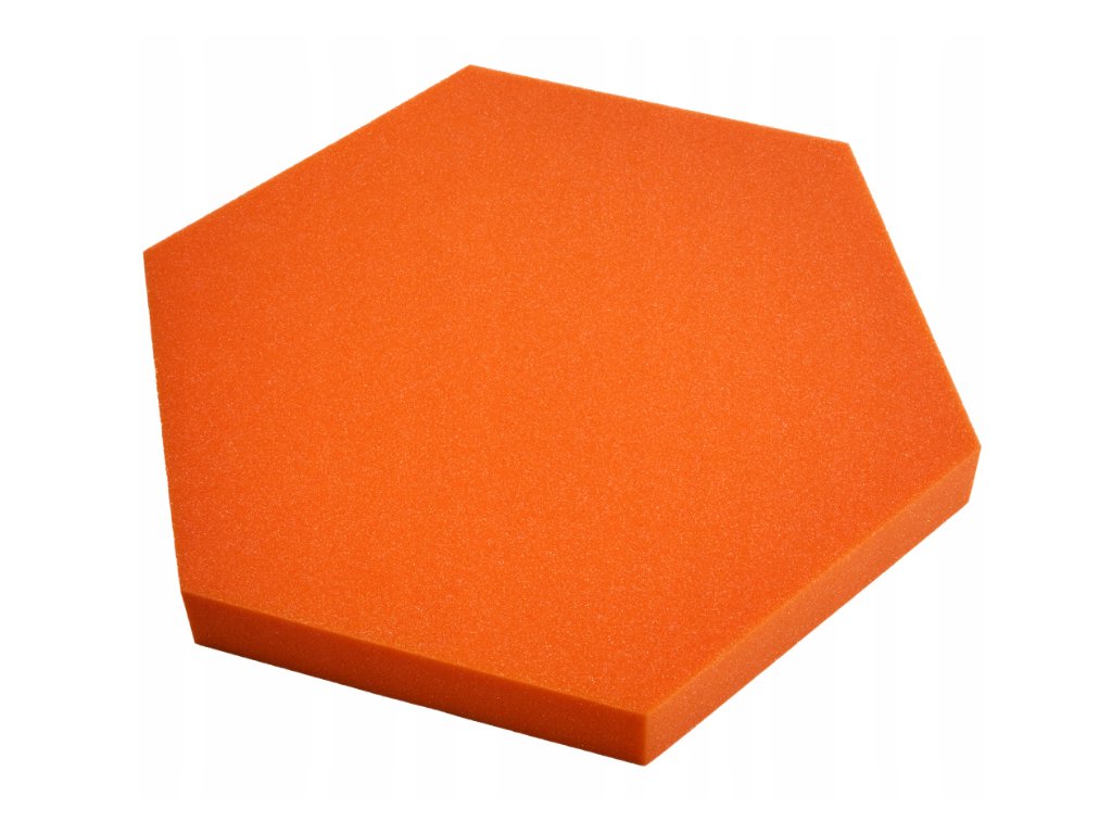 Dekorační akustický panel hexagon 50×50 cm, tloušťka 5 cm. PU pěna, redukuje echo a dozvuk. Jednoduchá montáž. Barva: oranžová.