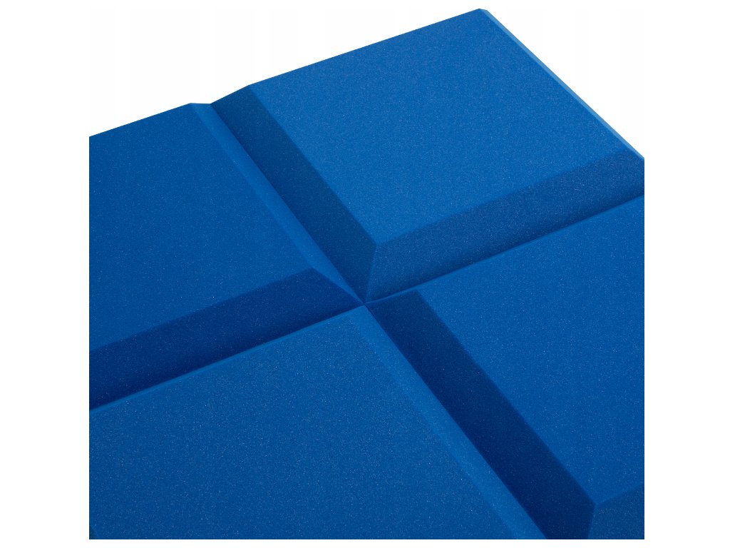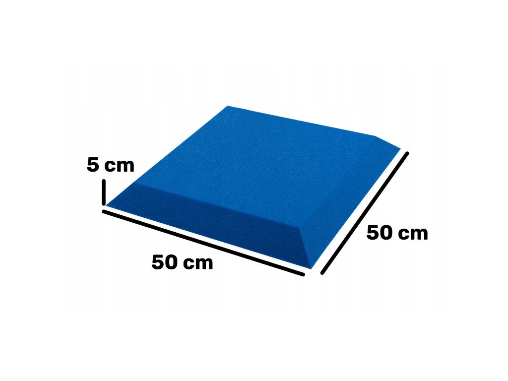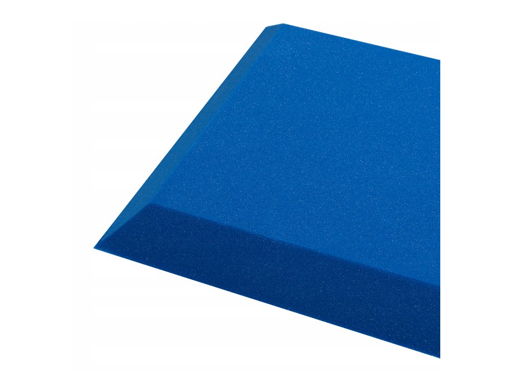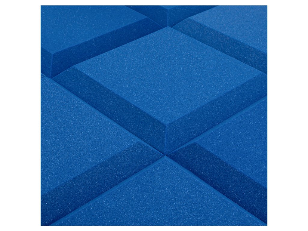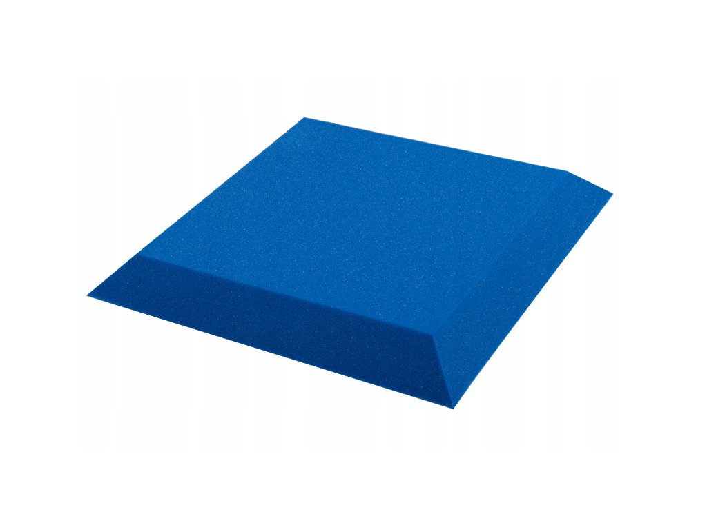 PU akustická pěna Bitmat AF-25, trapéz 50×50×5 cm. Snižuje echo a dozvuk, montáž lepidlem/páskou. Barva: modrá.