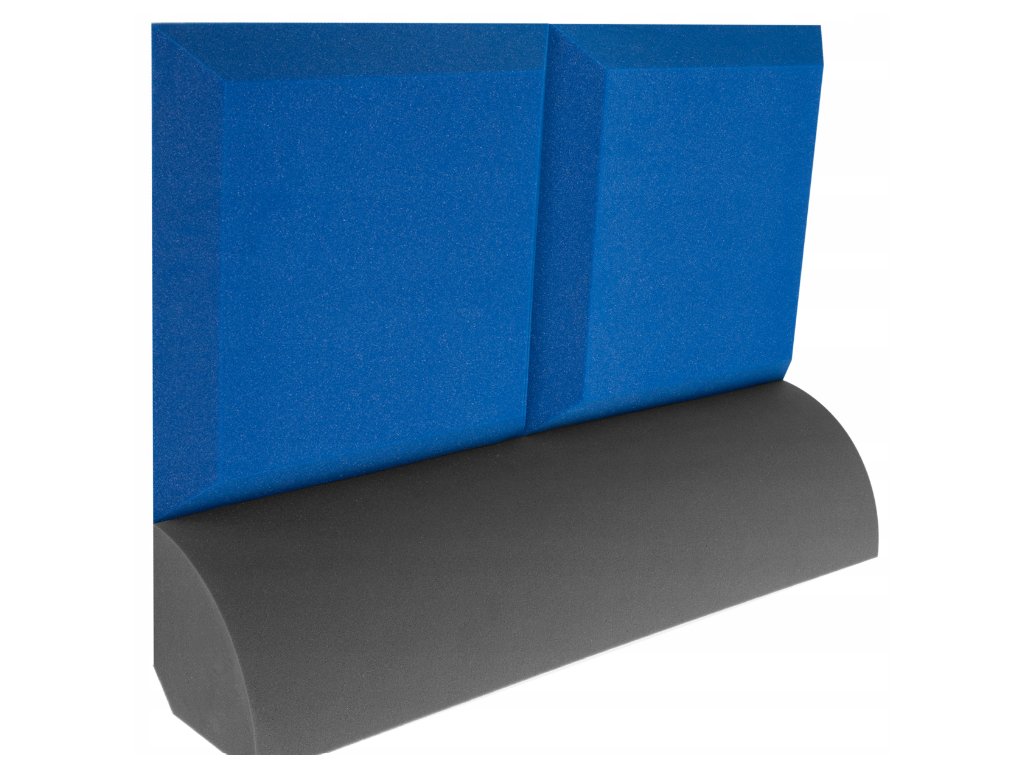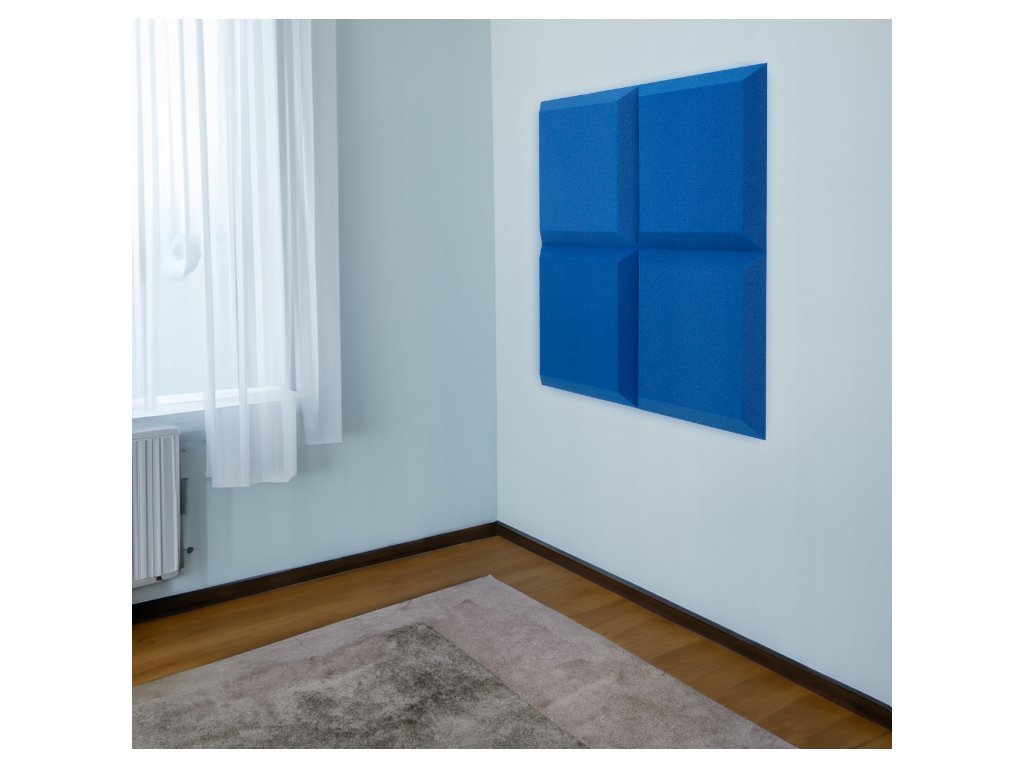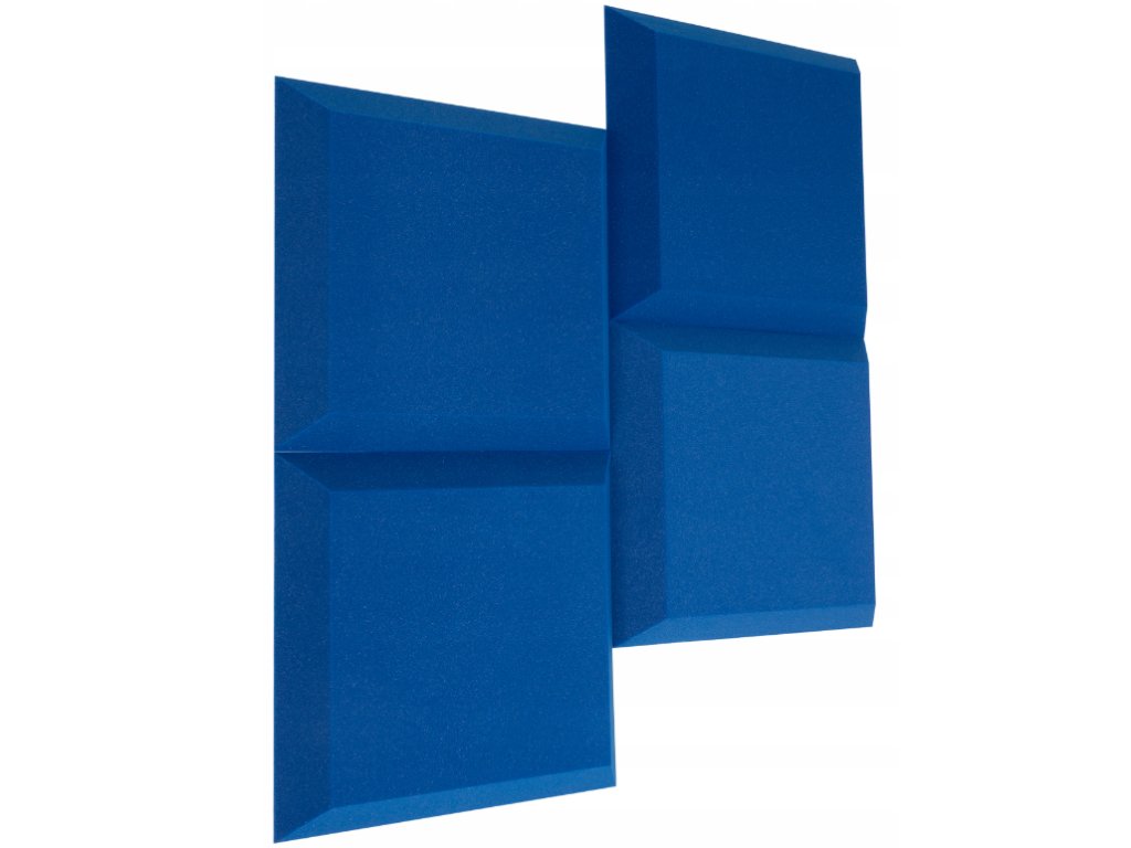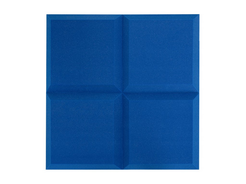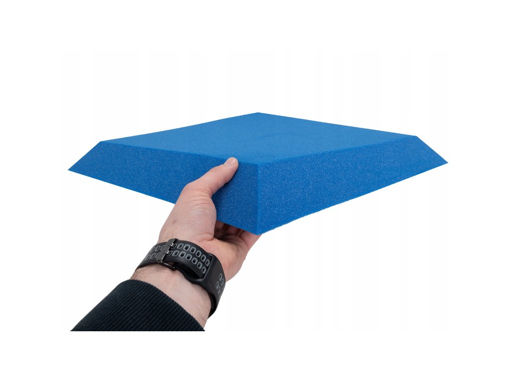 PU akustická pěna Bitmat AF-25, trapéz 50×50×5 cm. Snižuje echo a dozvuk, montáž lepidlem/páskou. Barva: modrá.