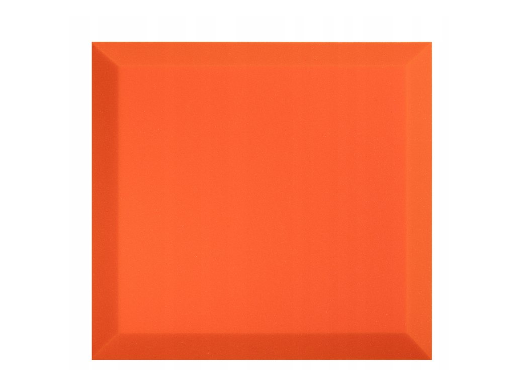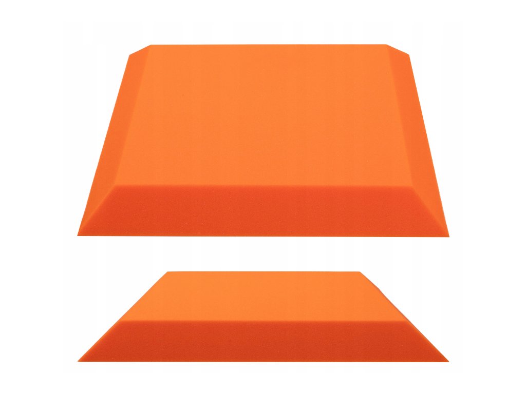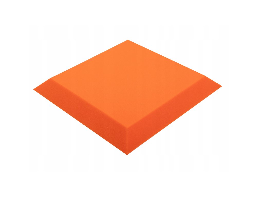 PU akustická pěna Bitmat AF-25, trapéz 50×50×5 cm. Snižuje echo a dozvuk, montáž lepidlem/páskou. Barva: oranžová.