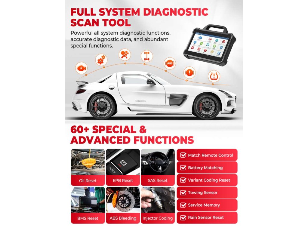 Obsahuje až 30 speciálních funkcí, včetně resetu oleje, regenerace DPF, kalibrace snímače úhlu řízení (SAS), inicializace brzd (EPB) a nastavení tlaku v pneumatikách (TPMS).