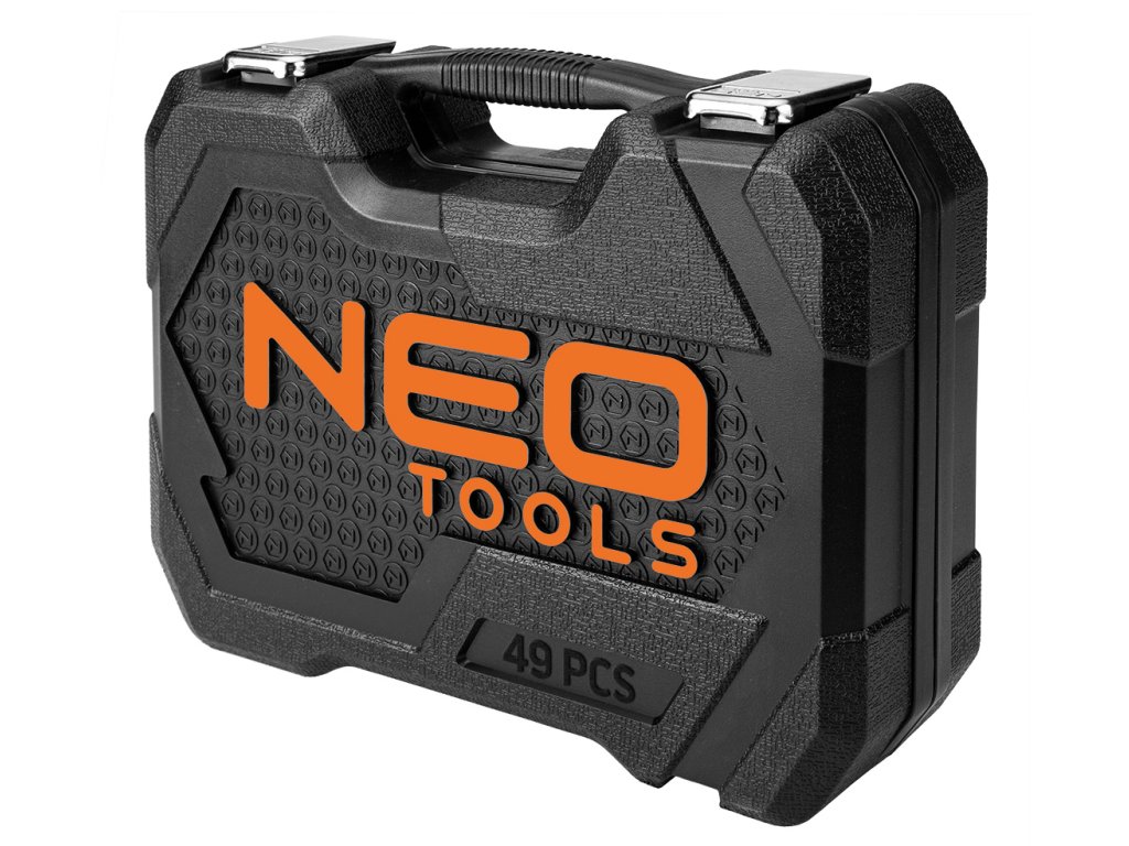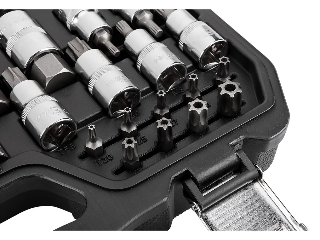 Sada bitů NEO Torx (ref. 08-713) Sada se skládá ze 49 prvků a obsahuje široký výběr bitů a nástrčných hlavic včetně dlouhých bitů na nástrčné hlavici ve velikostech H6 až H12 a T25 až T60, krátkých bitů na nástrčné hlavici H9 otvorem ve velikostech T20 až T60. Všechny prvky soupravy jsou vyrobeny z vysoce kvalitní oceli, resp. z chromvanádia pro bity.