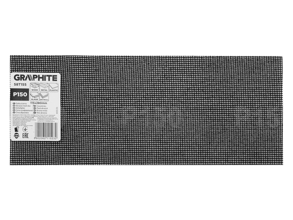 Brusná mřížka 115 x 280 mm, P150 58T155 značky GRAPHITE doporučená pro ruční použití na dřevo, kov, plast, sklo a sádrokarton. Je vybavena oboustrannou zrnitostí a černým zrnem z karbidu křemíku. Jedná se o vodotěsnou, snadno čistitelnou síťku GRAPHITE, která se flexibilně přizpůsobuje povrchu. Díky oboustranné zrnitosti je práce s ní hospodárná a efektivní. Osvědčí se při mnoha úkolech.