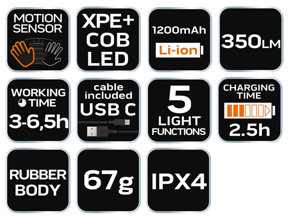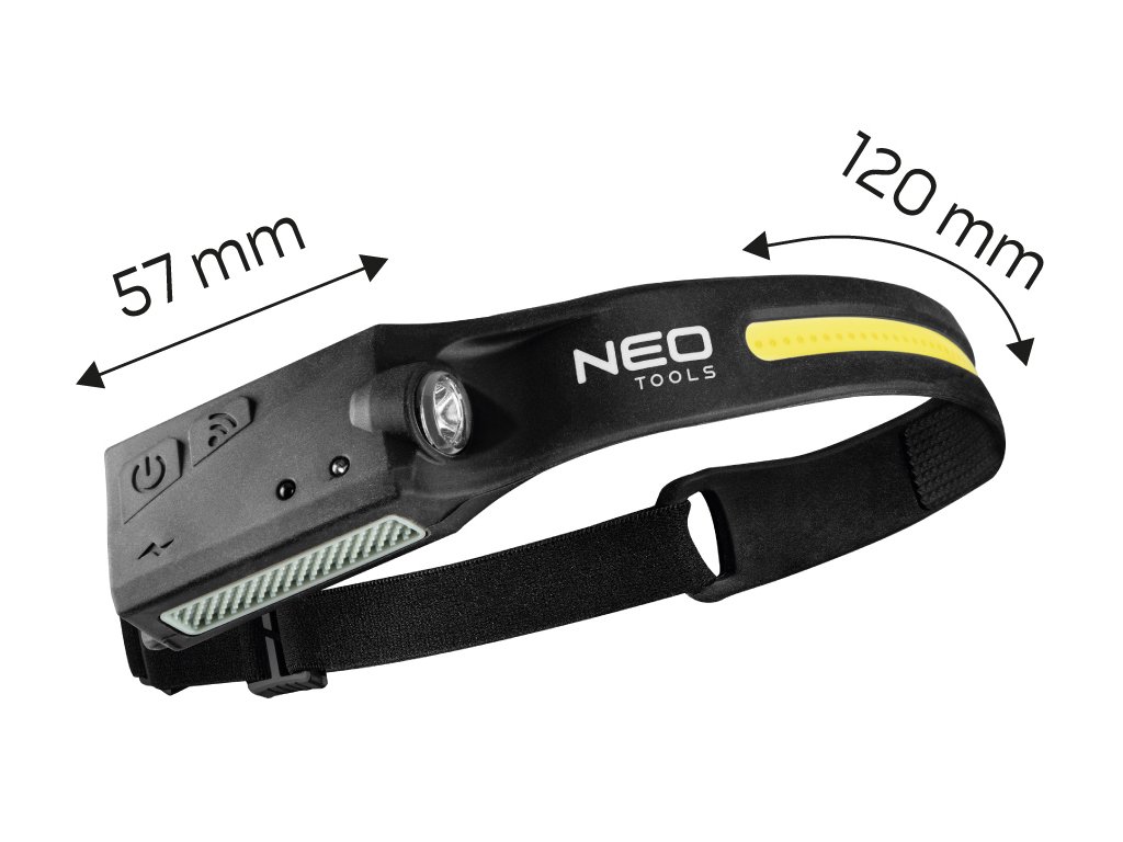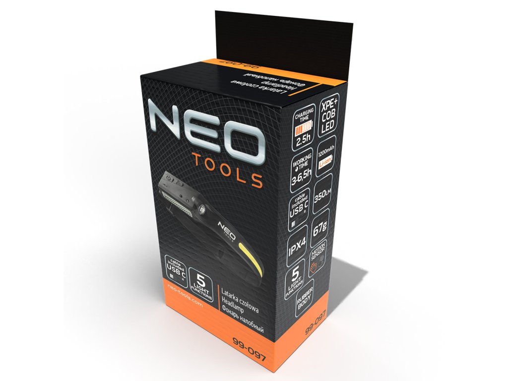 LED opasková čelová baterka 2 v 1 99-097 od společnosti NEO má světelný tok XPE 120 lumenů 3 W a COB 350 lumenů 5 W. Má dotykový spínač, který ovlivňuje intenzitu světla - od silného přes střední až po dlouhé vestavěné lithium0m napětím 3 až 4,5 V potřebuje k úplnému nabití 2,5 hodiny. Součástí soupravy je kabel USB C. Pružný kryt baterky je vyroben z gumy. Zařízení má stupeň krytí IPX4 a váží 95 g. třetí funkce - vysoké osvětlení XPE: 120 lumenů, čas svícení 4 - 4,5 h; čtvrtá funkce - XPE nízké osvětlení: 50 lumenů, čas svícení 6 - 6,5 h.
