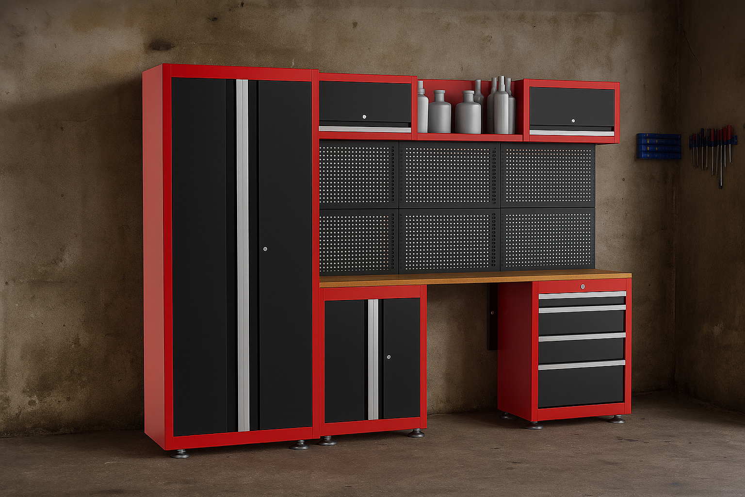 Prostorný úložný prostor pro uskladnění nářadí se skládá ze dvou malých skříněk oddělených policí přímo nad pracovním stolem, kde můžete umístit vše potřebné, co potřebujete mít po ruce. spreje a čističe . Skříňka vybavená čtyřmi zásuvkami, jedná skříňka s policemi a největší šatní skříň se dvěma dveřmi, ve které jsou umístěny další tři police. Každá skříňka má samostatné zamykání a magnety , které zabraňují náhodnému otevření dvířek. Spodní skříňky spolu s nejvyšší šatní skříní mají výškově nastavitelné nožičky. Další výhodou kterou oceníte při uložení nářadí je perforovaná stěna , na kterou si pomocí háčku můžete zavěsit vše co potřebujete mít hned po ruce.