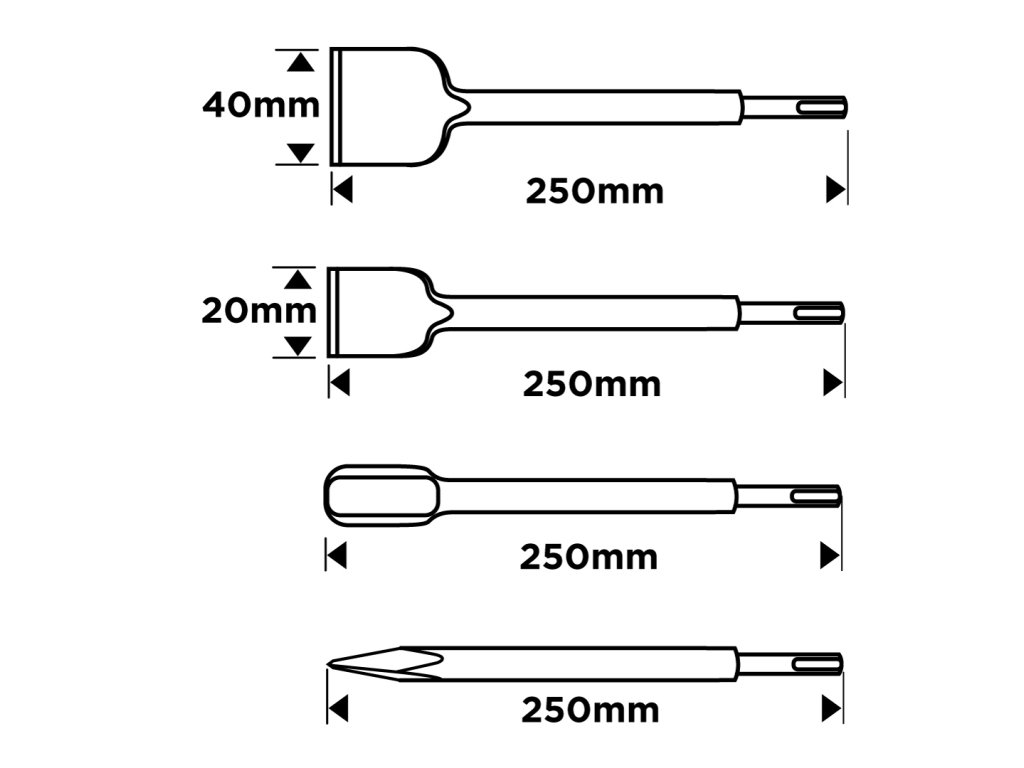 Sekáče SDS Plus, sada 4 kusů 55T115 od společnosti GRAPHITE jsou nástroje pro práci v betonu, vybavené rukojetí SDS Plus. Mají různé průměry a celkovou délku 250 mm. Budou neocenitelným pomocníkem v sadě nářadí každého kutila.