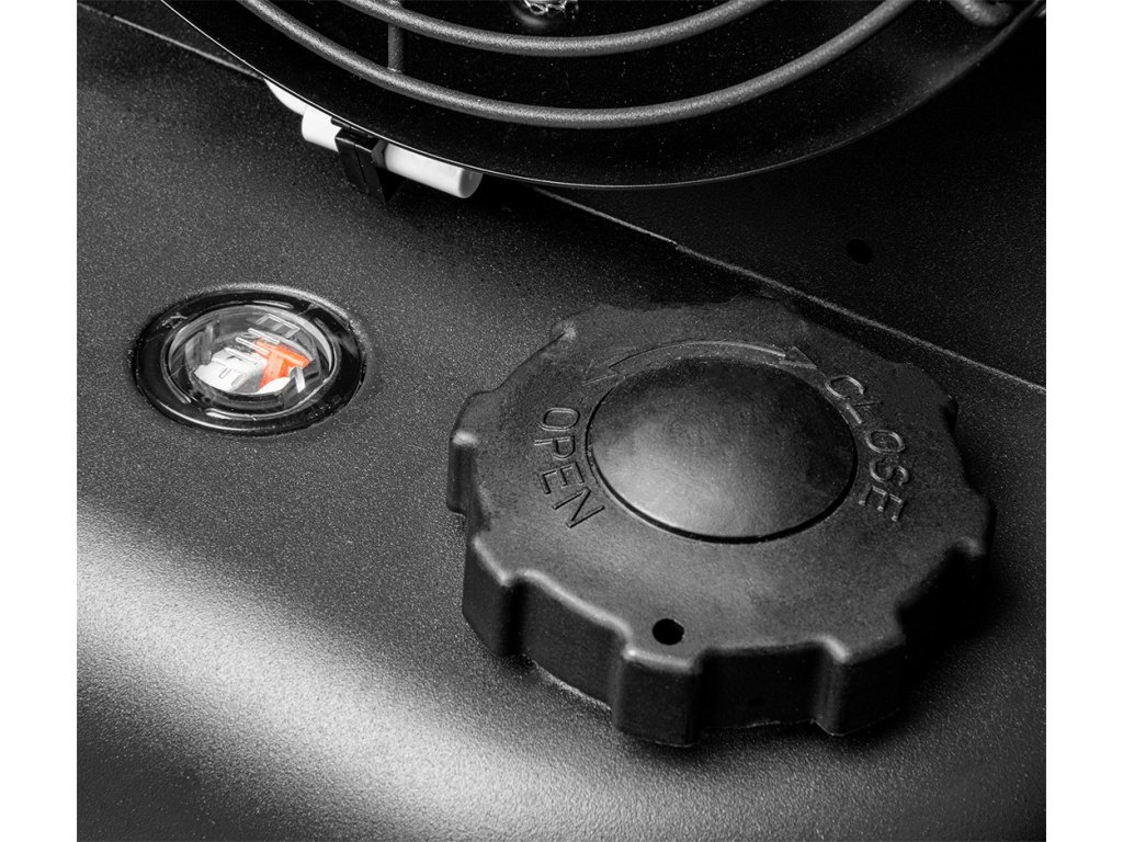 Pro bezpečný provoz je k dispozici snímač plamene, který automaticky vypne zařízení, pokud dojde palivo nebo dojde k přerušení hoření. Praktické okénko pro kontrolu hladiny paliva umožňuje snadné sledování zbývající zásoby.