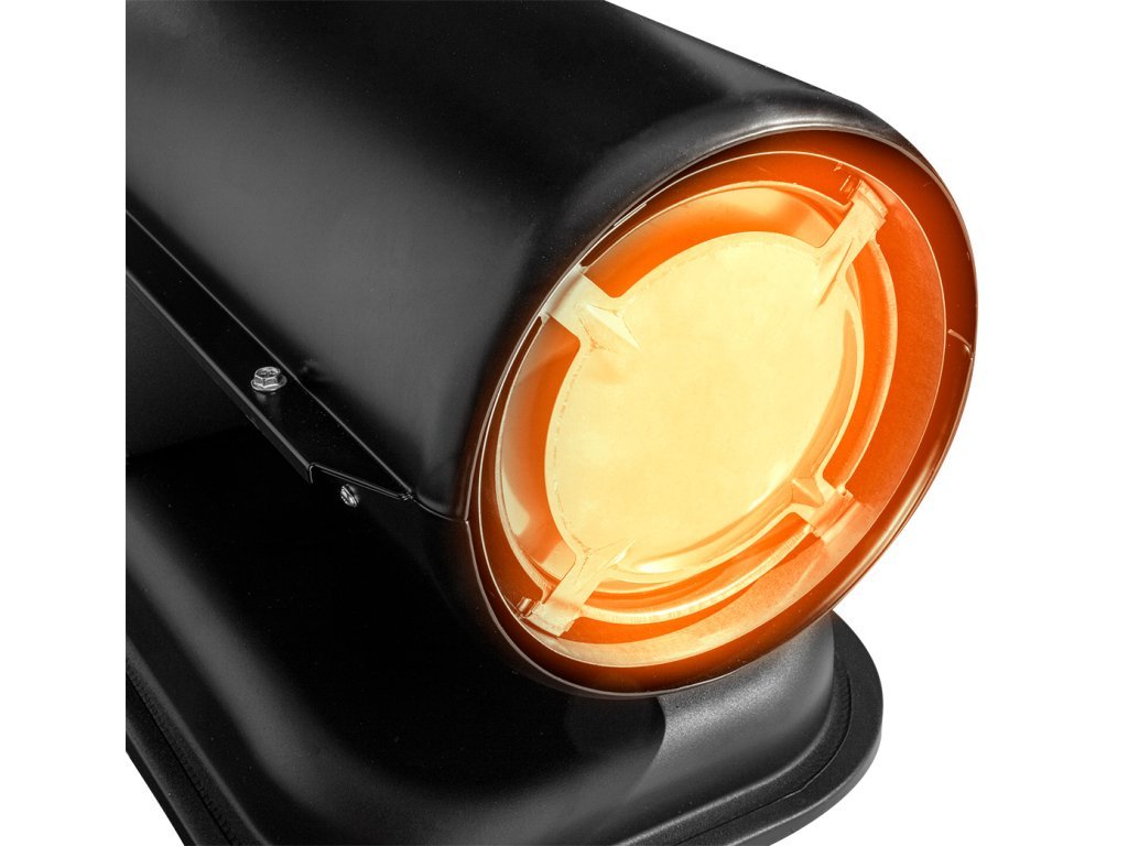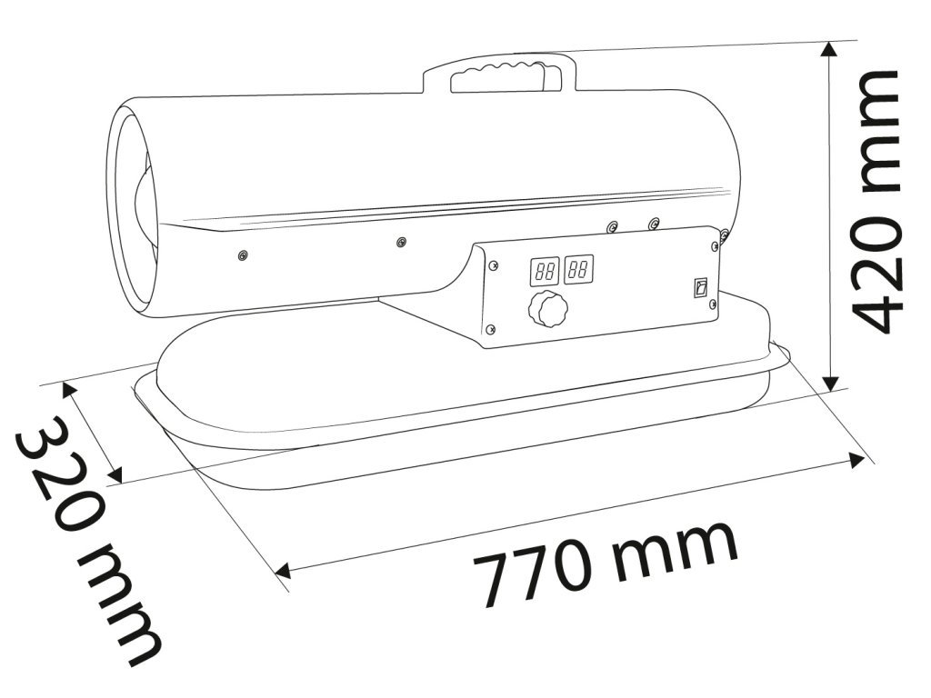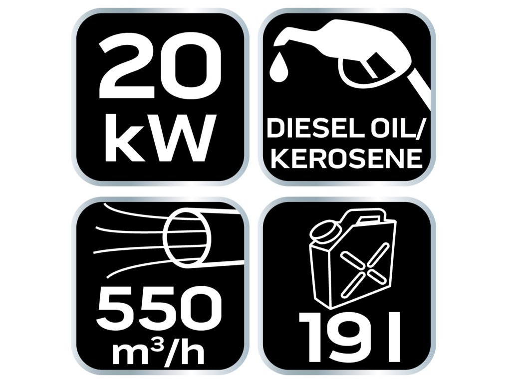 Výkonný naftový ohřívač 20 kW s termostatem, snímačem plamene a IPX4 krytím. Nádrž 19l, spotřeba paliva 1,9l/h, průtok vzduchu 550 m3/h, bez kol.
