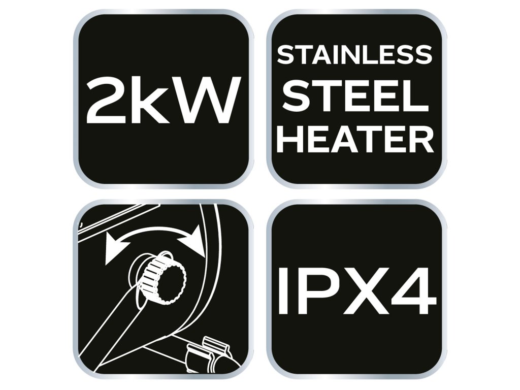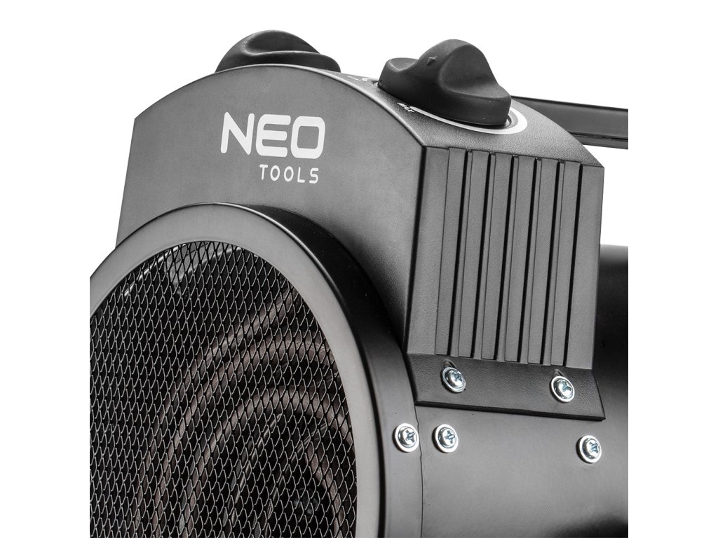 Elektrický ohřívač značky Neo o výkonu 2 kW. Je přenosný a vhodný k vytápění velkých místností jako jsou dílny, garáže, domácnosti, obchody či haly. Topné těleso z nerezavějící oceli a silný proud vzduchu zaručují rychlé ohřátí i na velkou vzdálenost s nízkou hladinou hluku. Izolovaná plastová rukojeť umožňuje snadné přenášení ohřívače. Práškový nástřik chrání celokovový kryt ohřívače před rzí. Třída vodotěsnosti IP24 umožňuje použití zařízení ve vlhkých a mokrých místnostech.