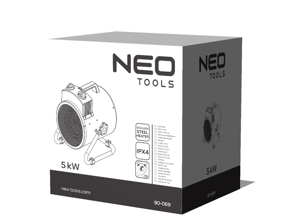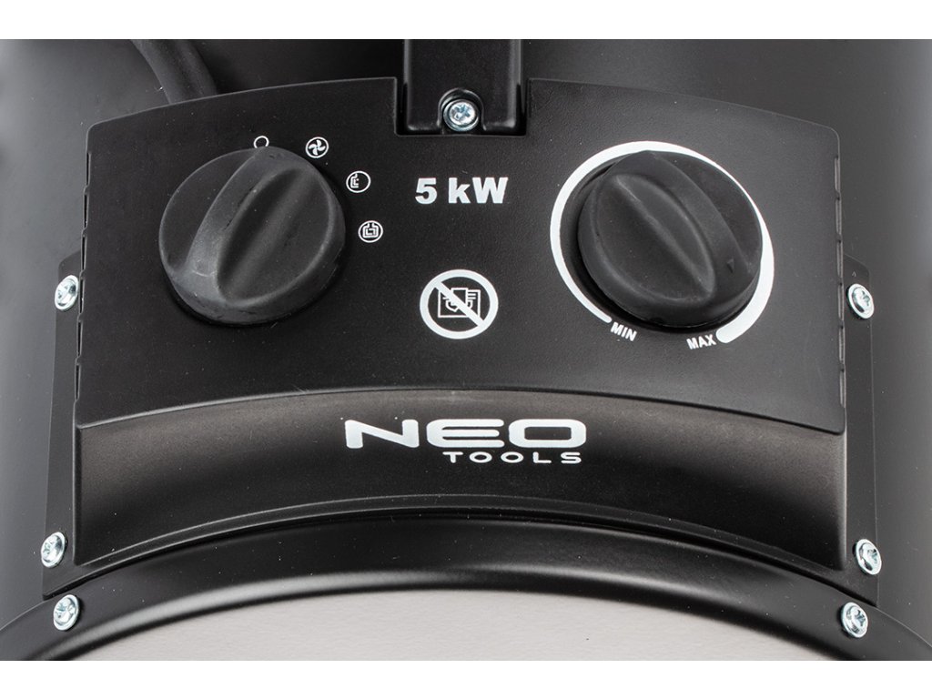 Elektrický ohřívač značky Neo o výkonu 5 kW. Je přenosný a vhodný k vytápění velkých místností jako jsou dílny, garáže, domácnosti, obchody či haly. Topné těleso z nerezavějící oceli a silný proud vzduchu zaručují rychlé ohřátí i na velkou vzdálenost s nízkou hladinou hluku. Izolovaná plastová rukojeť umožňuje snadné přenášení ohřívače. Práškový nástřik chrání celokovový kryt ohřívače před rzí. Třída vodotěsnosti IPX4 umožňuje použití zařízení ve vlhkých a mokrých místnostech.