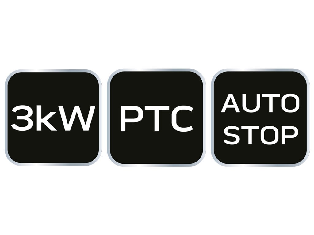 Keramický elektrický ohřívač PTC, výkon 3 kW, s termostatem a spínačem, s ventilátorem, automaticky se vypne při převrhnutí, nízká hlučnost, nízká spotřeba energie, průtok vzduchu 210 m³/h.
