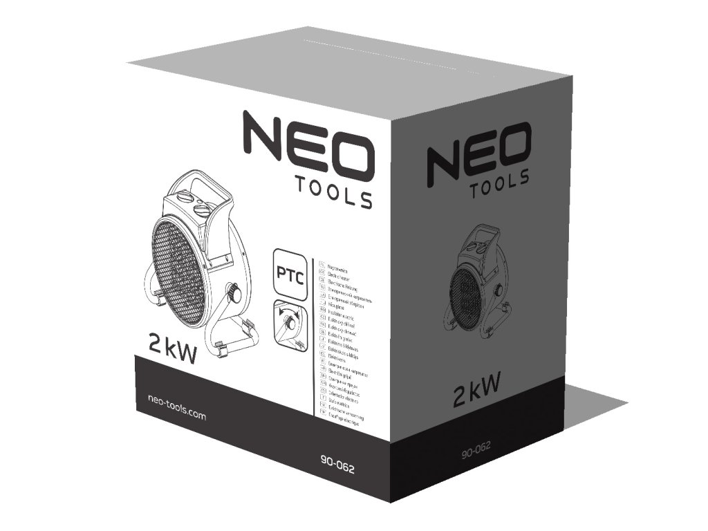 Elektrický ohřívač značky Neo o výkonu 2 kW. Je přenosný a vhodný k vytápění velkých místností jako jsou dílny, garáže, domácnosti či obchody. Keramické topné těleso a silný proud vzduchu zaručují rychlé ohřátí i na velkou vzdálenost s nízkou hladinou hluku. Izolovaná plastová rukojeť umožňuje snadné přenášení ohřívače. Práškový nástřik chrání kryt ohřívače před rzí. Zařízení je maximálně bezpečné nevytváří žádné nepříjemné pachy, vlhkost ani páru, zároveň je vybaveno systémem, který zajistí okamžité vypnutí při převrácení.