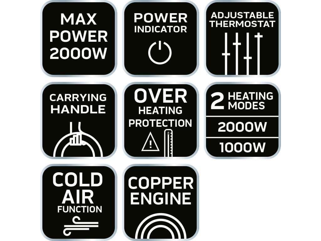 Ventilátorový ohřívač, 2 stupně 1000 W / 2000 W, nastavitelný termostat, vnitřní pojistka, ochrana proti přehřátí, délka kabelu 1 m, vytápěná plocha 25 m².