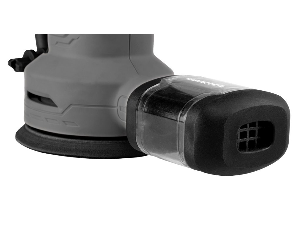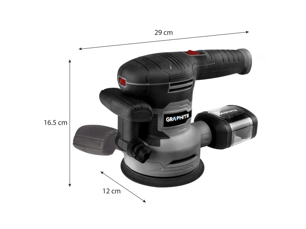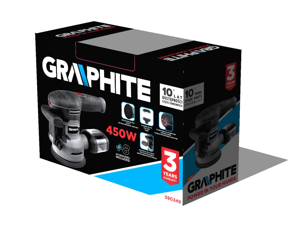 Excentrická bruska 450 W, kotouč 125/150 mm, kufr 59G349 od společnosti GRAPHITE je stroj se stopou 125/150 mm a výkonem 450 W. Dosahuje rychlosti 7 000 až 13 000 otáček za minutu a amplitudu kmitání. Bruska má zabudovaný systém odsávání prachu, který udržuje pořádek na pracovišti. Plynulé nastavení rychlosti (1-5 + maximum) umožňuje lepší kontrolu nad strojem. Užitečná je i přídavná rukojeť na krytu. Protiskluzová rukojeť a hmotnost 1,21 kg umožňují ovládání jednou rukou. Funkce blokování spínače pro nepřetržitý provoz je určena pro složitější úkoly. Souprava obsahuje: 1x pracovní patka 125 mm, 1x pracovní patka 150 mm, 6x brusný papír, šestihranný klíč, pevná nádoba s prachovým filtrem a přepravní kufřík. Excentrická bruska GRAPHITE bude v dílně nepostradatelná při broušení a vyhlazování povrchů.