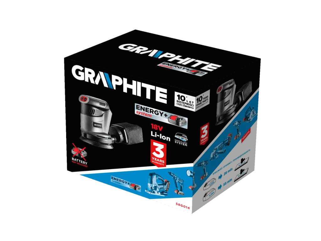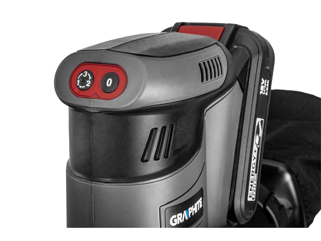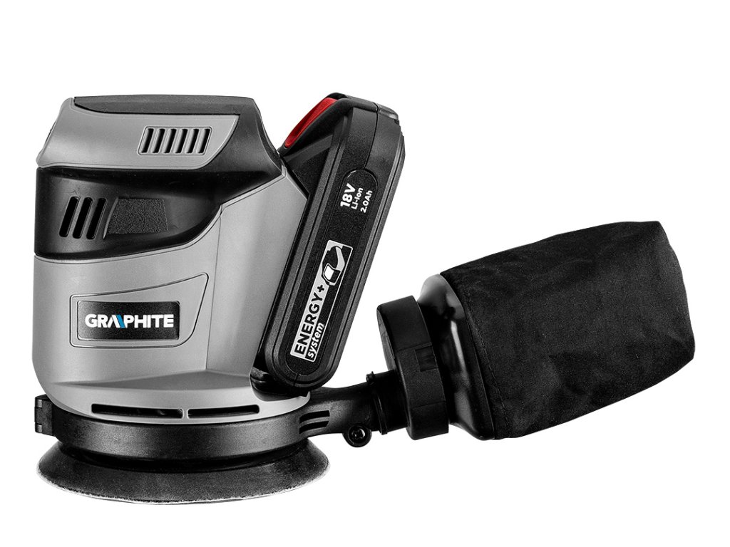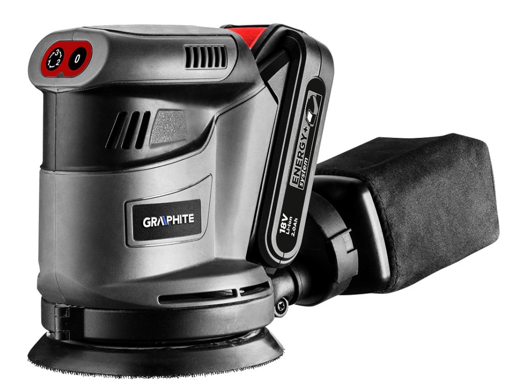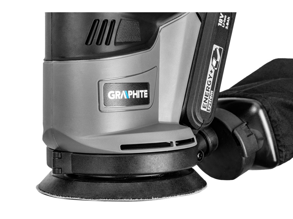 Excentrická bruska GRAPHITE, spolupracuje s akumulátory 18 V Li-Ion GRAPHITE Energy+. Bruska má patku o průměru 125 mm s možností upevňování brusného papíru na suchý zip. Zařízení pracuje ve třech různých rychlostech otáčení: 5000/7000/9000 minut, kterým odpovídají frekvence kmitání: 10000/14000/18000 minut. Amplituda kmitů je 2,7 mm. Místo uchopení je pokryto protiskluzovým materiálem, díky čemuž lze s elektrickým nářadím pracovat bezpečně a pohodlně - i jednou rukou. Bruska má výkonný systém odvádění prachu, díky kterému odpad vznikající během broušení neztěžuje práci. V sadě s bruskou se nacházejí: nádoba s filtrem pro shromažďování prachu a brusný papír.