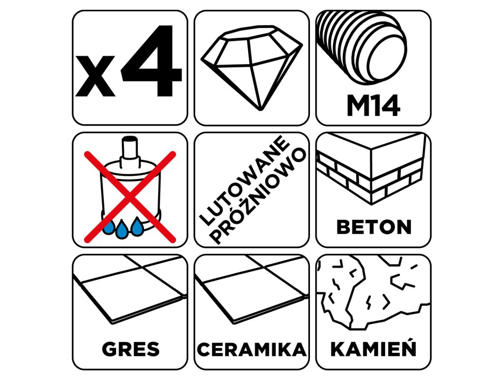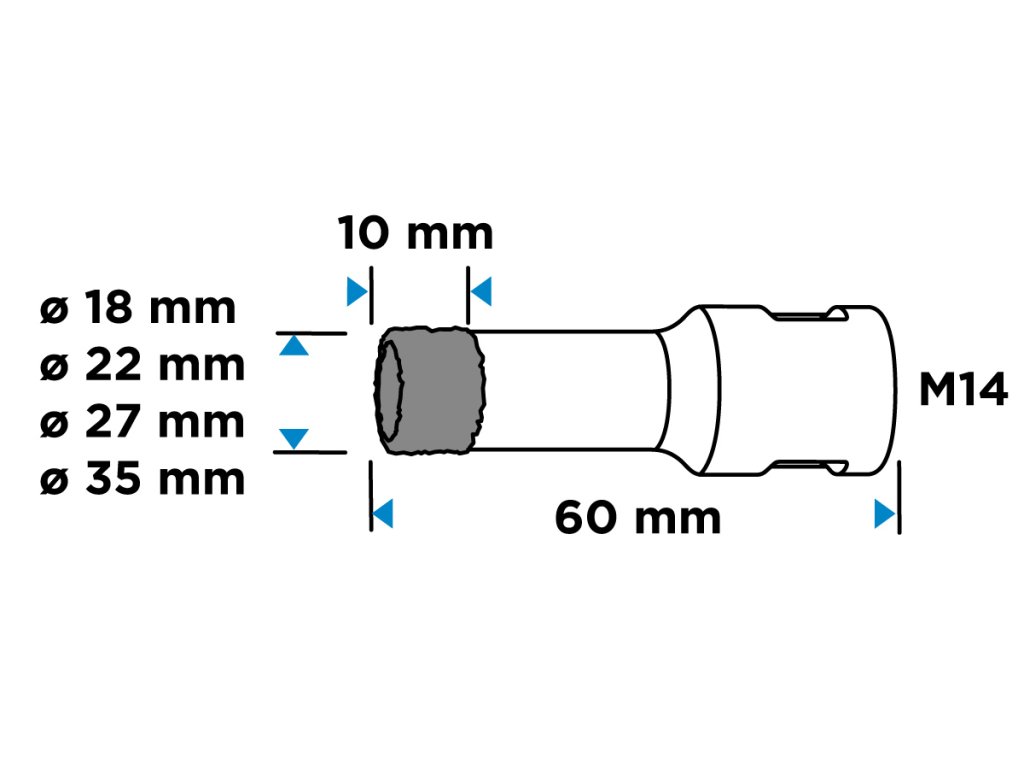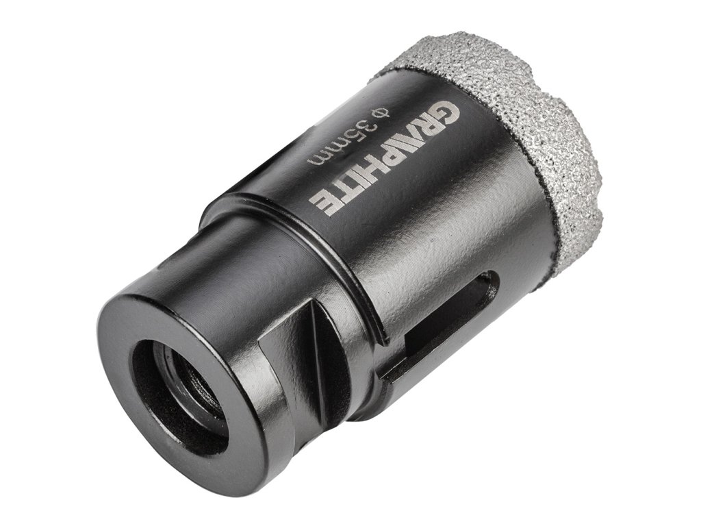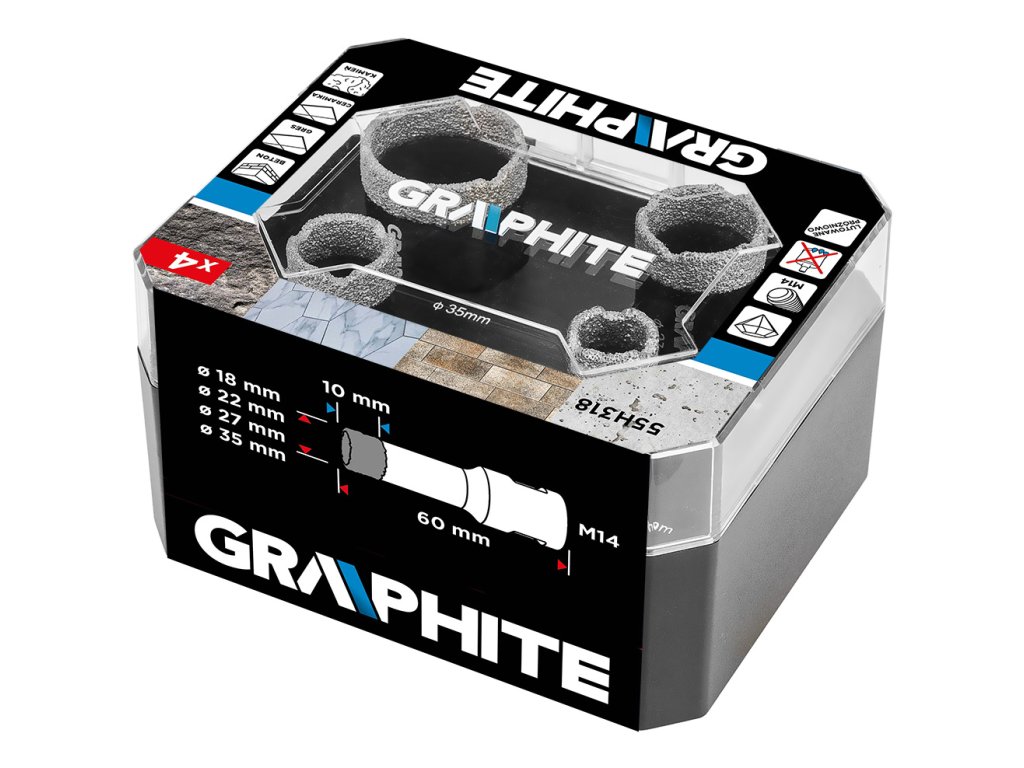 Diamantové pily na otvory (18, 22, 27, 35 mm), 4-dílná souprava 55H318 od společnosti GRAPHITE je souprava čtyř pil na otvory o průměrech: 18, 22, 27, 35 mm, které jsou vyrobeny z robustní oceli C45. Vyznačují se maximální hloubkou vrtání 30 mm a rychlostí až 13 000 otáček za minutu. Díky sklíčidlu M14 a tvrdosti HV 175-200 mají všestranné využití. Nejlépe se s nimi pracuje s keramikou, kameninou, betonem, slínkem a kamenem. Velikost zrna D46 a výška diamantového povlaku 10 mm zajišťují čisté a přesné řezání i v náročných podmínkách. Sada diamantových pil na díry GRAPHITE se doporučuje jak pro profesionály, tak pro kutily.