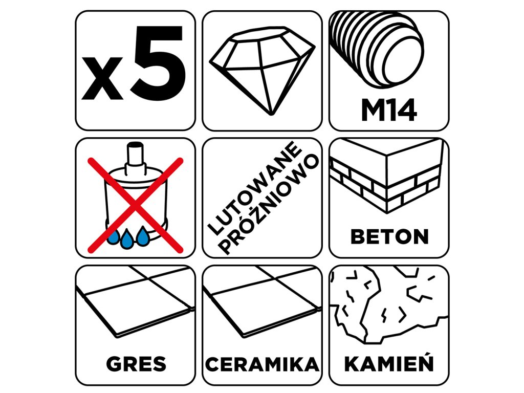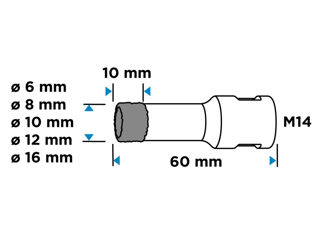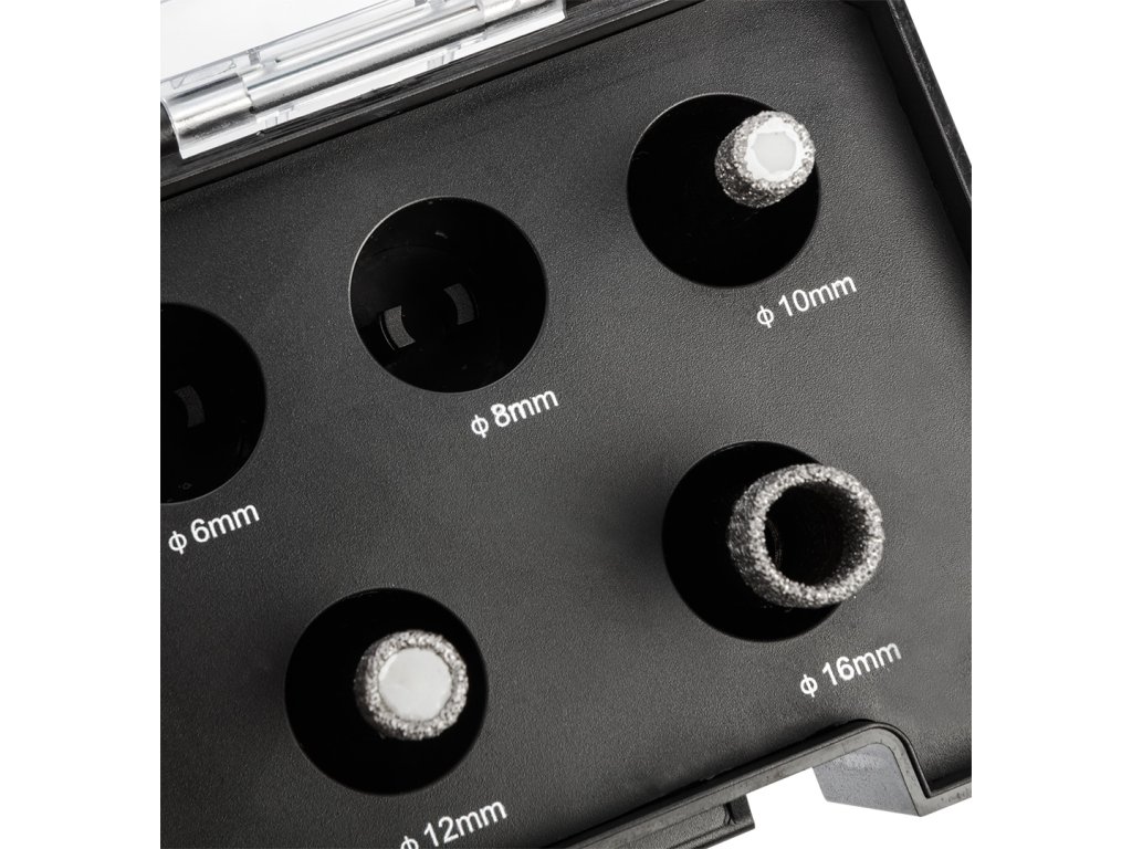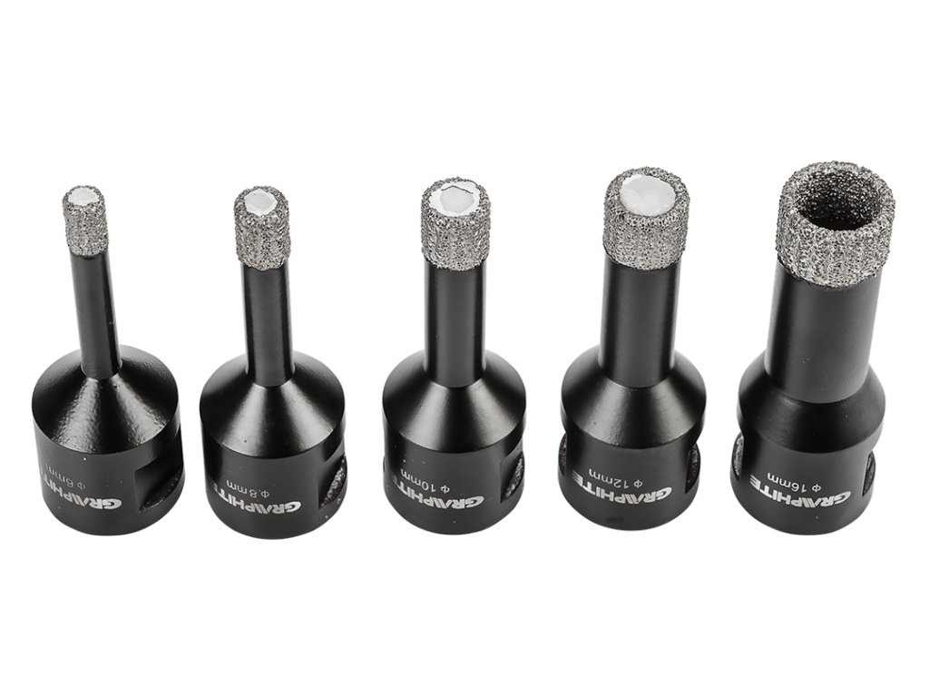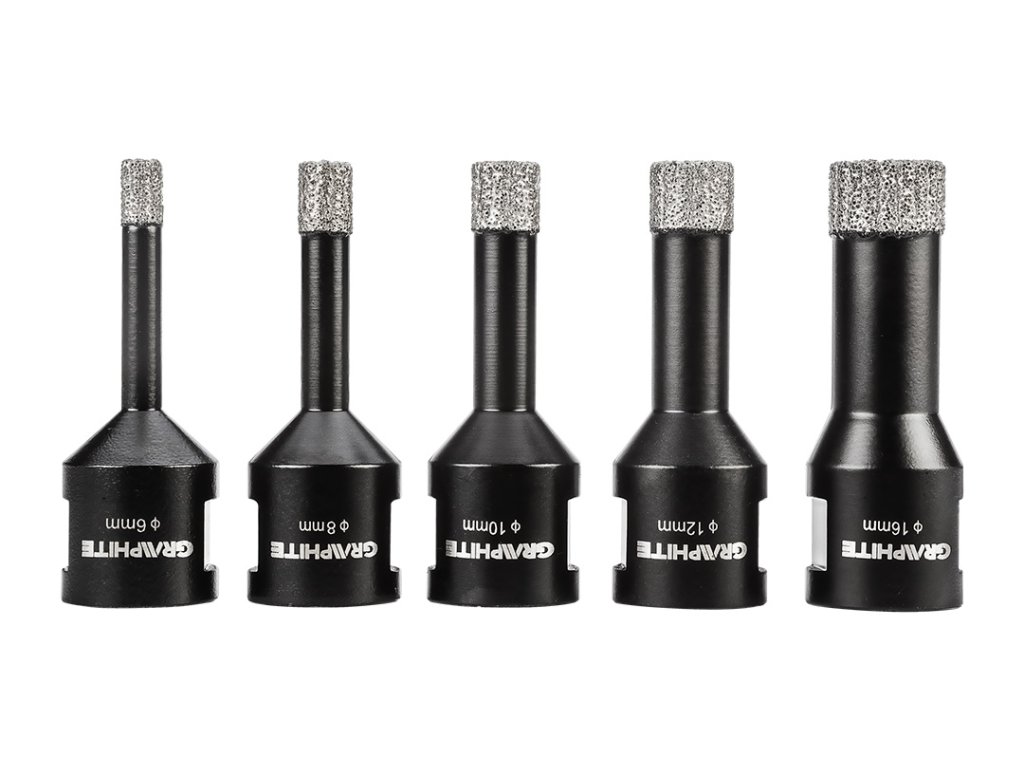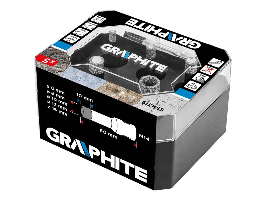 Diamantové pily na otvory (6, 8, 10, 12, 16 mm), 5dílná sada 55H319 od společnosti GRAPHITE je sada pěti pil na otvory o průměrech: 6, 8, 10, 12, 16 mm, které jsou vyrobeny z robustní oceli C45. Vyznačují se maximální hloubkou vrtání 30 mm a rychlostí až 13 000 otáček za minutu. Díky sklíčidlu M14 a tvrdosti HV 175-200 mají všestranné využití. Nejlépe se s nimi pracuje s keramikou, kameninou, betonem, slínkem a kamenem. Velikost zrna D46 a výška diamantového povlaku 10 mm zajišťují čisté a přesné řezání i v náročných podmínkách. Sada diamantových pil na díry GRAPHITE se doporučuje jak pro profesionály, tak pro kutily.