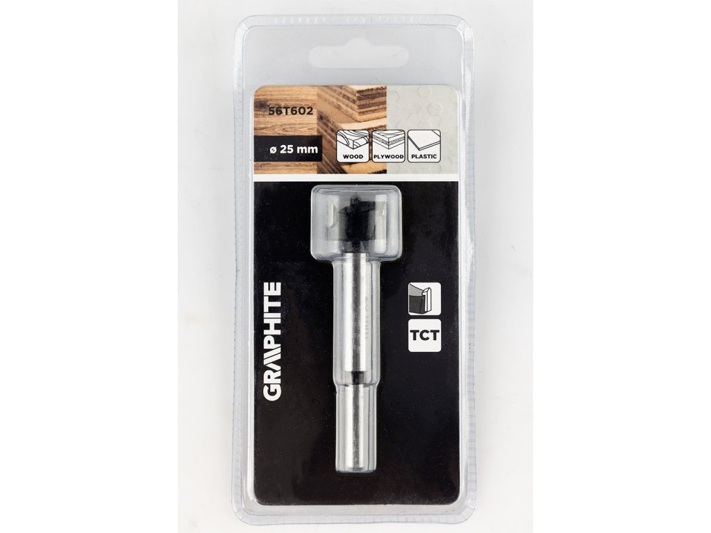 25 mm široká fréza GRAPHITE 56T602 je určena pro vrtání otvorů do dřeva, nábytkových desek a plastů. Čepele s karbidovými hroty (TCT) poskytují odolnost a přesnou povrchovou úpravu. Konstrukce nástroje umožňuje vytvářet otvory s plochým dnem a samostředící hrot umožňuje přesné umístění v materiálu. Fréza GRAPHITE má středové a vnější řezné čepele, celkovou délku 85 mm a válcovou stopku.