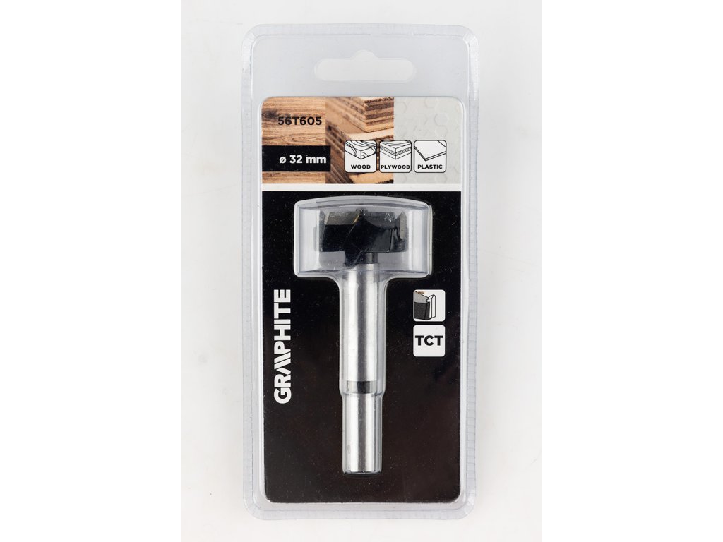 32 mm široká fréza GRAPHITE 56T605 je určena pro vrtání otvorů do dřeva, nábytkových desek a plastů. Čepele s karbidovými hroty (TCT) poskytují odolnost a přesnou povrchovou úpravu. Konstrukce nástroje umožňuje vytvářet otvory s plochým dnem a samostředící hrot umožňuje přesné umístění v materiálu. Fréza GRAPHITE má středové a vnější řezné čepele, celkovou délku 85 mm a válcovou stopku.