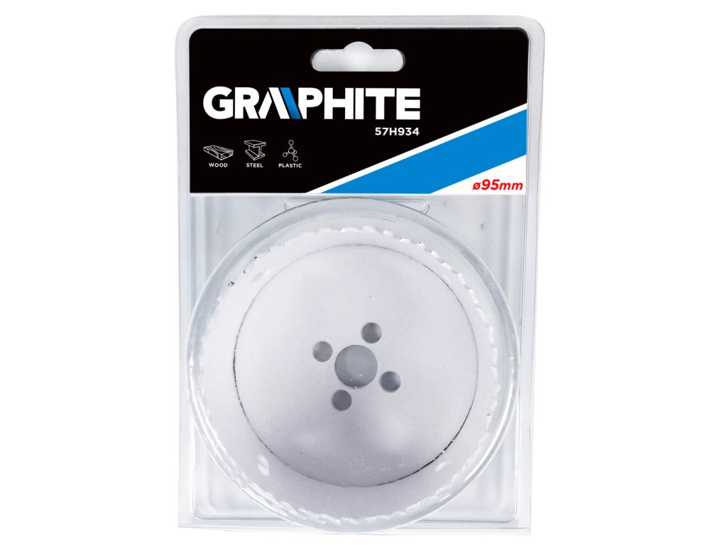 Bimetalová děrovka GRAPHITE prostřednictvím progresivních zubů vyrobených z rychlořezné oceli umožňuje efektivní vrtání přesných otvorů v oceli, nerezové oceli, dřevě, plastech, kompozitních materiálech.