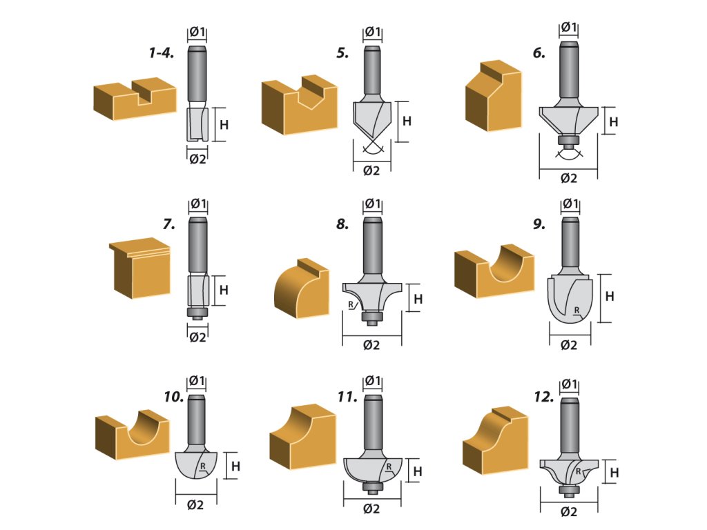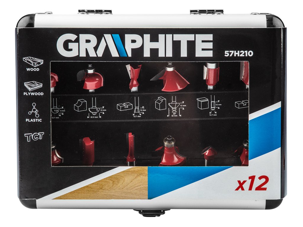 Sada vidiových frézek GRAPHITE (ref. č. 57H210), různé tvary řezných čepelí, určené pro přesné obrábění dřeva s vysokorychlostními horními frézami. Kvůli čepelím z jemného karbidu a ideální rovnováze umožní získat dokonale obrobené povrchy.