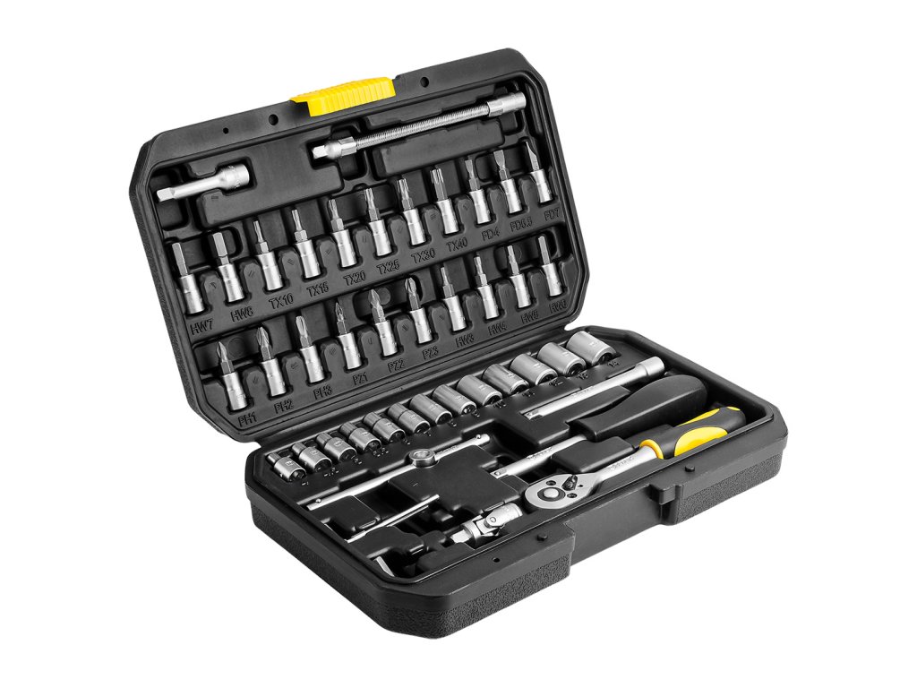 Sada nástrčných klíčů TOPEX 1/4" (ref. 38D640) sestává ze 46 prvků uspořádaných v pohodlném a odolném plastovém kufříku. Všechny prvky jsou vyrobeny z vysoce kvalitní oceli, která zaručuje dlouhou životnost nástrojů. Sada obsahuje mimo jiné širokou škálu šestihranných nástrčných hlavic. držák bitů, příslušenství (např. kloub, nástavce, šestihranné klíče, adaptér na šroubovák, knoflík). Souprava má všestranné využití při drobných montážních pracích, opravách vozidel a strojů a jiných pracích v domácnosti a v garáži každého kutila. Značka TOPEX je určena pro domácí kutily.