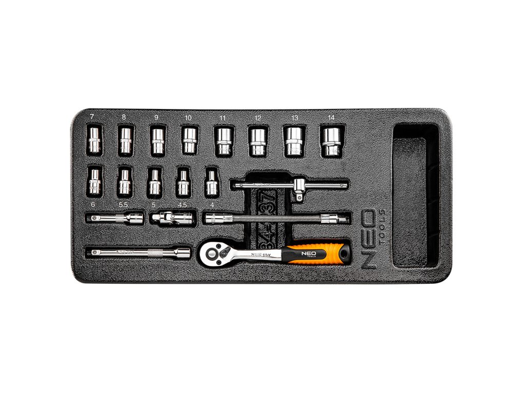 Sada nástrčných klíčů NEO 1/4" (ref. 84-237) se skládá z 19 prvků vyrobených z vysoce kvalitní chrom-vanadové oceli. Sada obsahuje ráčnu vybavenou odolným ráčňovým mechanismem (72 zubů). Sada obsahuje širokou škálu šestihranných 4 nástrčných nástrčných. Doplňují jej praktické nástavce (včetně flexibilního nástavce), průchozí kolo a kloub.