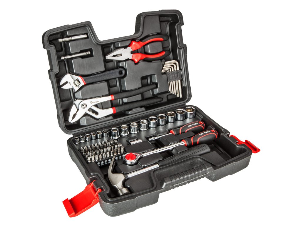 Sada nářadí Top Tools (ref. 38D510) je určena pro základní, lehké opravárenské práce. Obsahuje 81 kusů ve velikostech ?" a ?" uložených v praktickém a robustním plastovém kufříku. Obsahuje kompletní balení šestihranných nástrčných hlavic ve dvou velikostech, ráčnu a příslušenství. Všestrannost sady zvyšuje přítomnost univerzálních kleští, kleští na trubky, nastavitelného klíče, kladiva, šestihranných klíčů, šroubovacích bitů a příslušenství. Sada obsahuje také adaptéry na šroubováky, takže díly lze snadno používat s elektrickým nářadím.