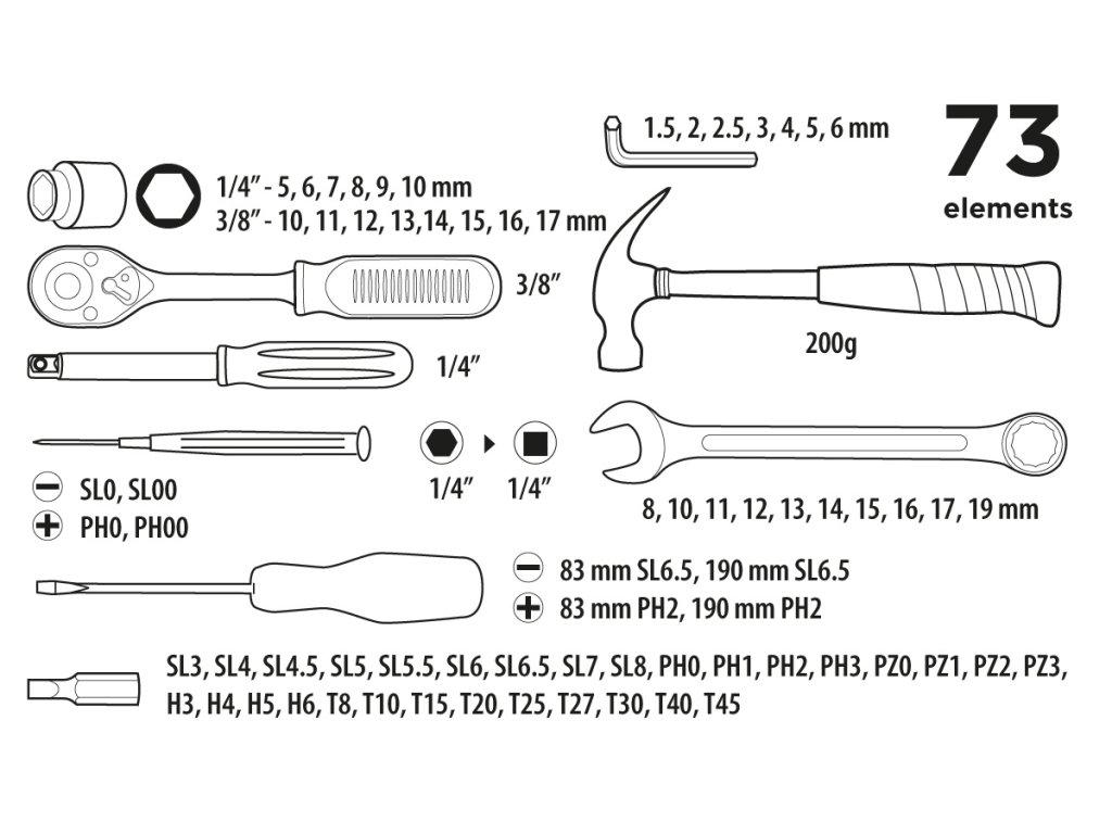 73 ks Materiál – uhlíková oceľ. Račňa 3/8” 39 zubov, skrutkovacia rukoväť ?”, držiak na bity ?”, stolárske kladivo 200g, precízne skrutkovače 4 ks: PH00, PH0, SL00, SL0; skrutkovače 190 mm, 2 ks: PH2, SL6.5; skrutkovače 100 mm 2 ks: PH2, SL6.5; očkoploché kľúče 10 ks: 8, 10, 11, 12, 13, 14, 15, 16, 17, 19 mm; kľúče HEX 7 ks: 1.5, 2, 2.5, 3, 4, 5, 6 mm; nástavce 3/8”, 8 ks: 10, 11, 12, 13, 14, 15, 16, 17 mm; nástavce ?”, 6 ks: 5, 6, 7, 8, 9, 10 mm; skrutkovacie nástavce 25 mm: SL3, SL4, SL4.5, SL5, SL5.5, SL6, SL6.5, SL7, SL8, H3, H4, H5, H6, PH0, PH1, PH2, PH3, PZ0, PZ1, PZ2, PZ3, T8, T10, T15, T20, T25, T27, T30, T40, T45.