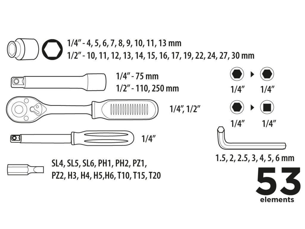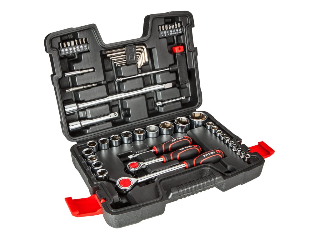 Sada nástrčných klíčů ?", ?" Top Tools (ref. 38D530) se skládá z 53 kusů uspořádaných v robustním plastovém kufříku. Sada obsahuje šestihranné nástrčné hlavice dvou velikostí, ráčny a kompletní sadu příslušenství. Funkčnost soupravy zvyšují adaptéry pro šroubováky, díky kterým lze prvky snadno použít pro práci s elektrickým nářadím. Souprava se dá použít pro lehké práce kolem domu a garáže.