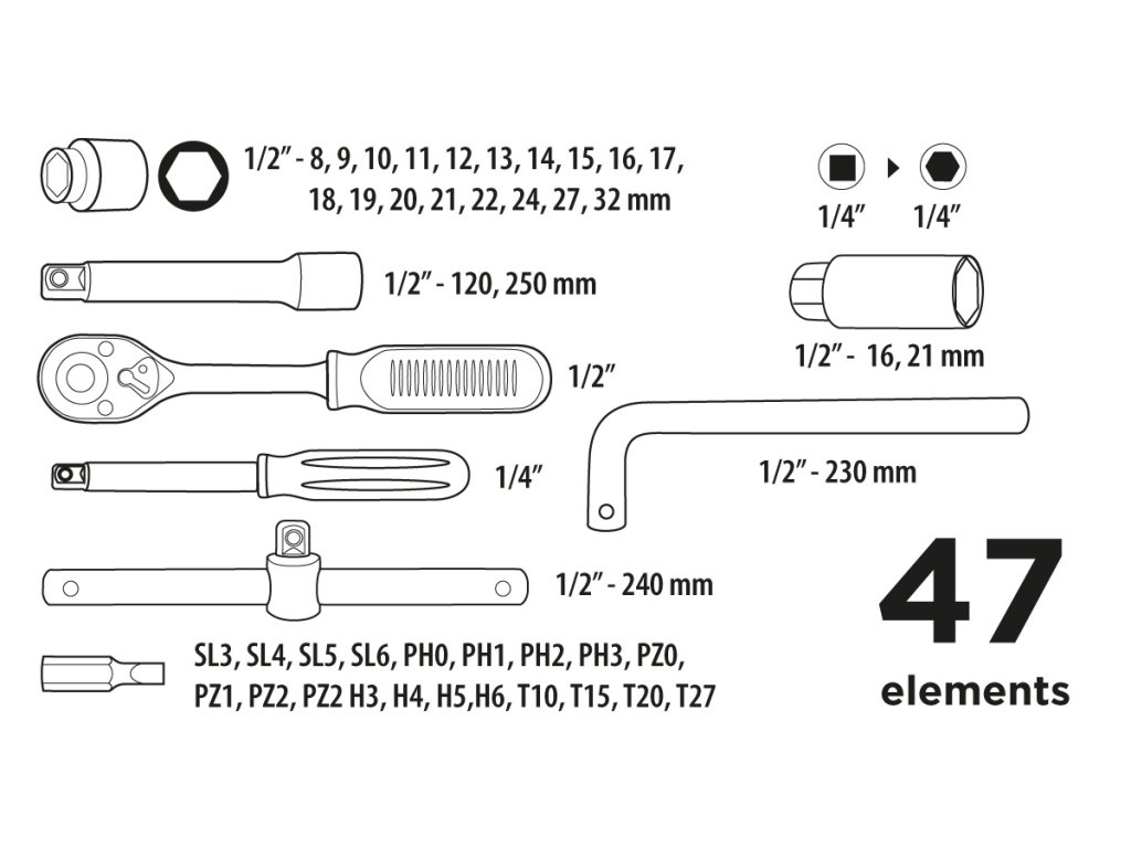 Sada nástavcových klíčů 1/4", 1/2", 47 ks 38D550