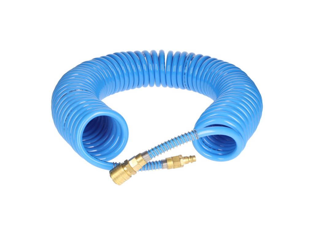 Hadice 12 x 8 mm je modrá polyuretanová spirálová hadice o délce 15 metrů. Je vybavena rychlospojkou a mosazným adaptérem, vyztuženým pružinami.