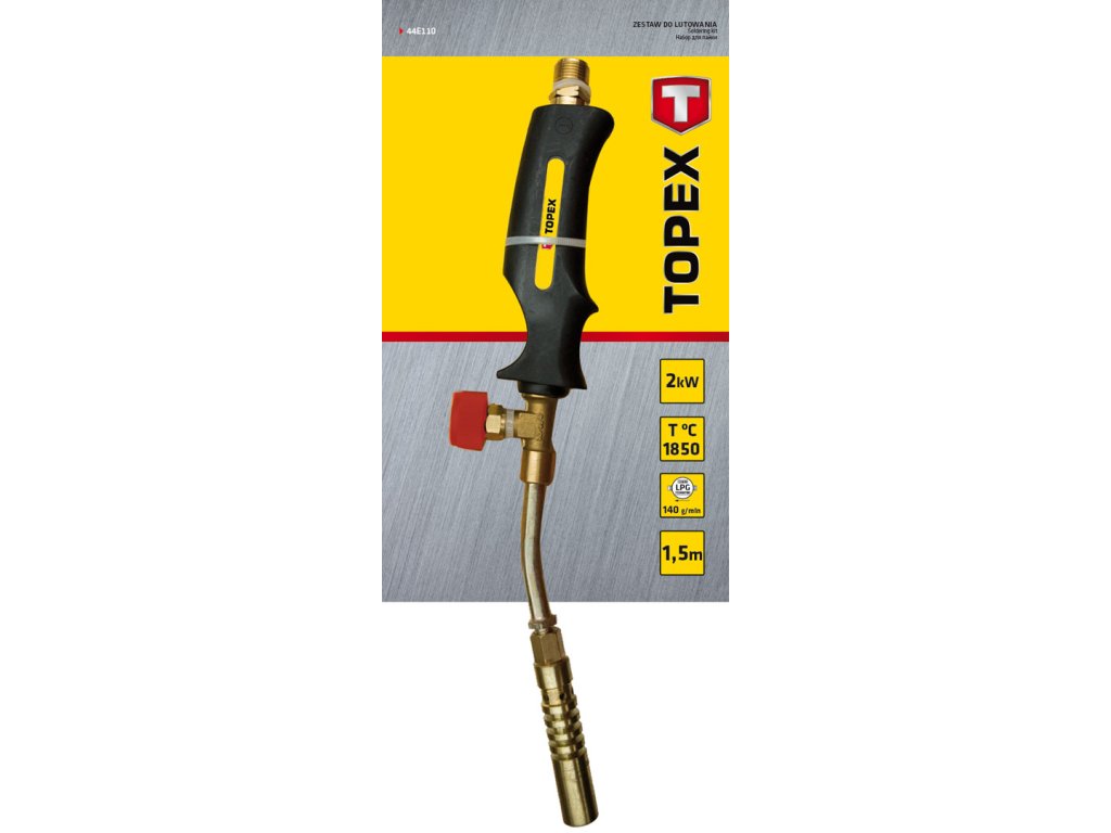 Hořák TOPEX (ref. 44E110) Výkon hořáku 2 kW, teplota plamene 1850 °C. Hořák z mosazi, průměr 17 mm. S 1,5 m hadicí. Souprava je ideální pro práce v dílně i pro pájení měděných instalací. Značka TOPEX je určena pro domácí kutily.