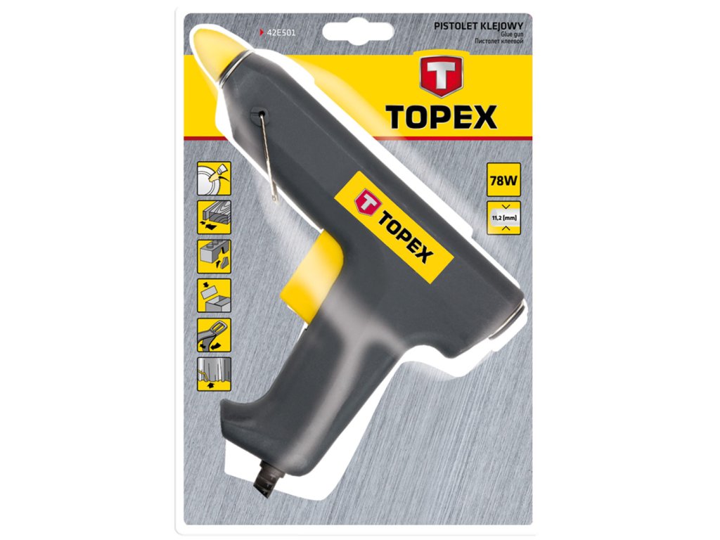 Lepicí pistole TOPEX (ref. 42E501) na lepidlo o průměru 11,2 mm, výkon 78 W. Šikovný kryt a pohodlná rukojeť snižují námahu při práci. Tepelně odolné pouzdro. Lepicí hrot pro přesné nanášení lepidla. Výkon lepidla 12-18 g/min. Ideální pro dílny domácí kutily, jakož i pro profesionální aplikace, jako je oprava koberců, výroba nábytku. Soulad s evropskými bezpečnostními normami zaručuje certifikát CE. Značka TOPEX je určena pro domácí kutily.
