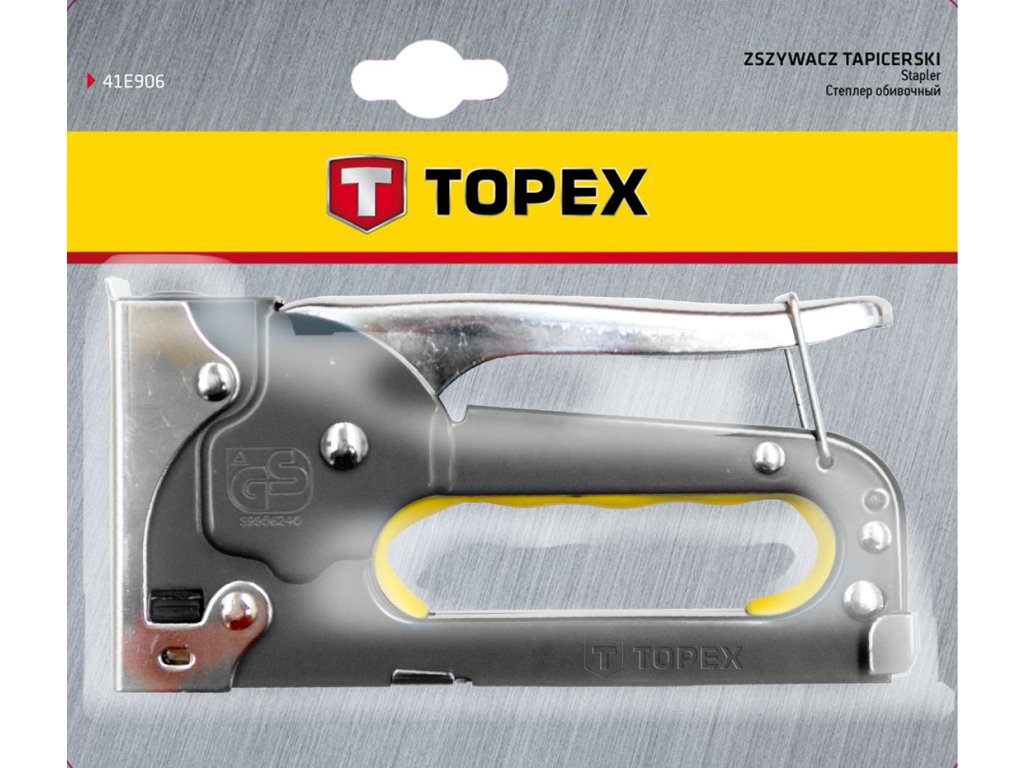 TOPEX sešívačka na čalounění (ref. 41E903) na sponky J, velikost 4-8 mm. Kovové pouzdro zaručuje odolnost nástroje. Ideální pro čalounění, dekorace, upevnění fólie, kůže. Přesně zasáhne sponky, aniž by je rozdrtil, a to iv tvrdých materiálech. Značka TOPEX je určena pro domácí kutily.