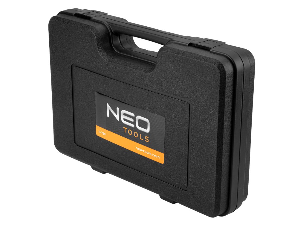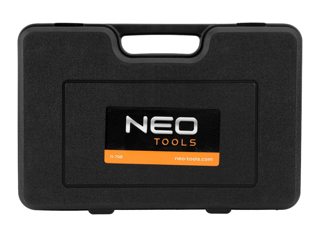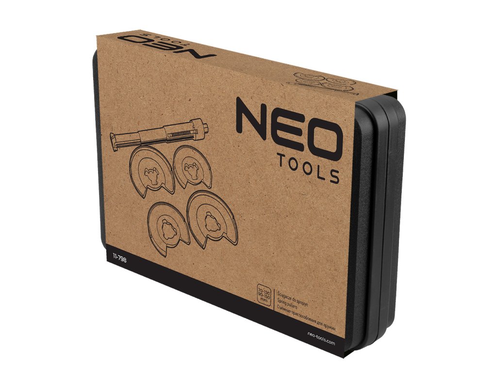 NEO teleskopický stahovák pružin je sada určená k demontáži a nastavení přední a zadní vinuté pružiny. Je vybaven dvěma páry vyměnitelných kotoučů s bezpečnostním systémem se třemi háčky. Souprava je zabalená v kufru. K pohonu stahováku nepoužívejte rázový klíč.