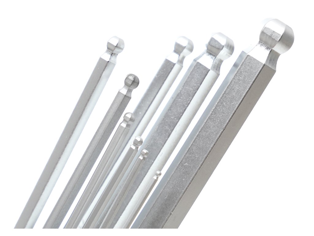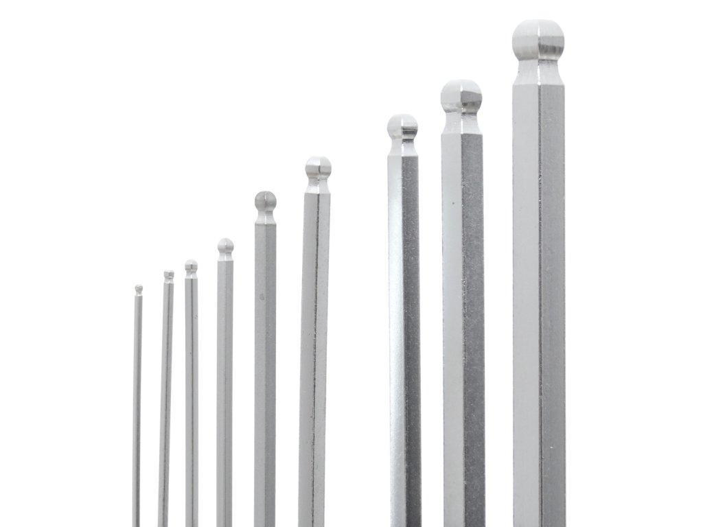 Klíče jsou vyrobeny z vysoce kvalitních materiálů, vhodné pro každého profesionála i amatéra - mistra. Sada obsahuje imbusové klíče o rozměrech: 1,5 mm, 2 mm, 2,5 mm, 3 mm, 4 mm, 5 mm, 6 mm, 8 mm, 10 mm. Konec každého klíče je zakončen speciální kuličkou, která usnadňuje práci pod každým úhlem a odšroubování šroubů, ke kterým je obtížný přístup. Kulička se osvědčí tehdy, když máme omezené možnosti efektivního manévrování s klíčem.