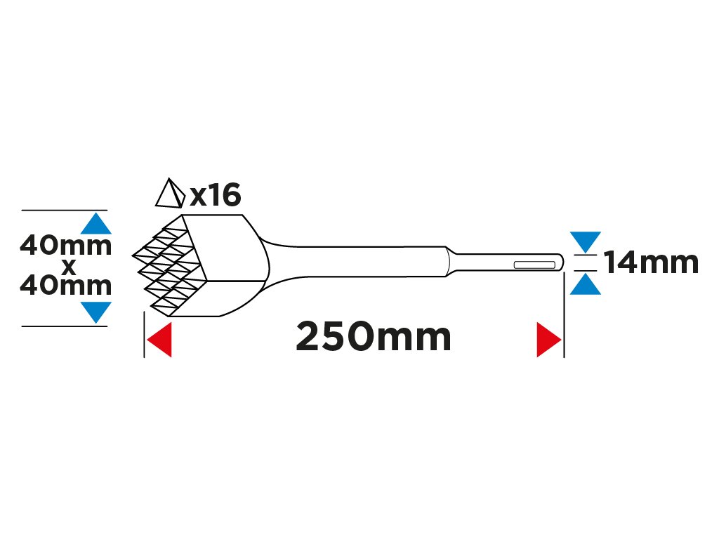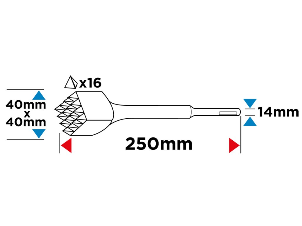 SDS Plus GRAPHITE stříkačka (ref. 57H573) s pracovním hrotem o šířce 40 x 40 mm a 16 zuby dodává opracovávanému materiálu kamínkovou strukturu, čímž se stává drsnějším pro lepší spojení s maltou, lepidlem nebo pryskyřicí.