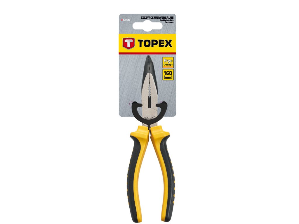Podlouhlé zahnuté kleště TOPEX (ref. 32D103) o délce 160 mm. Vyrobeno z kalené oceli, navíc s indukčně kalenými řeznými plochami. Ergonomické rukojeti pokryté protiskluzovým materiálem zajišťují pohodlí a bezpečnost při práci. Výrobek se dokonale přizpůsobí tvaru ruky. Značka TOPEX je určena pro domácí kutily.