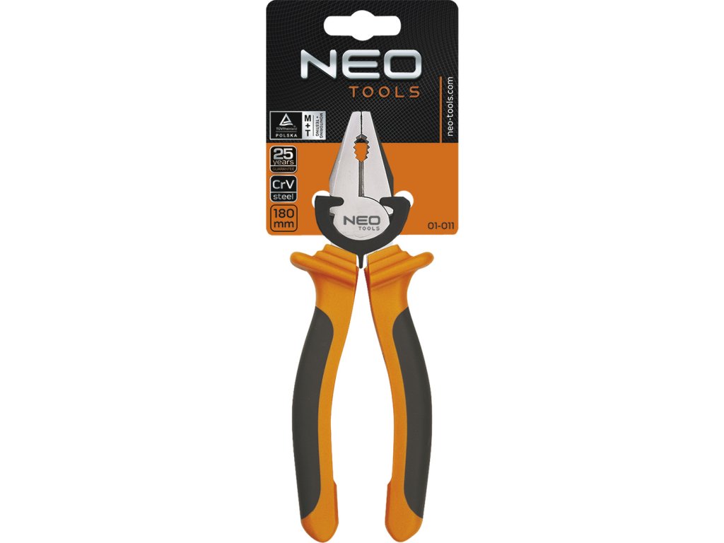 Univerzální kleště NEO (ref. 01-011) o rozměru 180 mm, vyrobené v souladu s normou DIN 5746. Čelisti z vysoce kvalitní indukčně kalené oceli CS (55-60 HRC) zajišťují účinné stříhání a tvarování tvrdých drátů. Ergonomická rukojeť ze dvou materiálů zvyšuje pohodlí uživatele. Kvalita nářadí potvrzená certifikátem TÜV a 25letou zárukou výrobce. Značka NEO splňuje očekávání profesionálů.