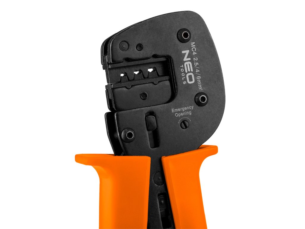 Kleště pro lisování konektorů MC4 NEO (ref. 01-555) jsou nepostradatelným nástrojem při montáži fotovoltaických panelů. Je vhodný pro lisování rovných a šikmých konektorů typu BNC, F, IEC a RCA s možností nastavení. Přesný ráčnový mechanismus umožňuje přesné lisování svorek. Prodloužená ramena umožňují volně zvýšit upínací sílu a tím i životnost konektoru. Sada obsahuje vyměnitelný, nastavitelný držák kolíků se šestihranným klíčem.