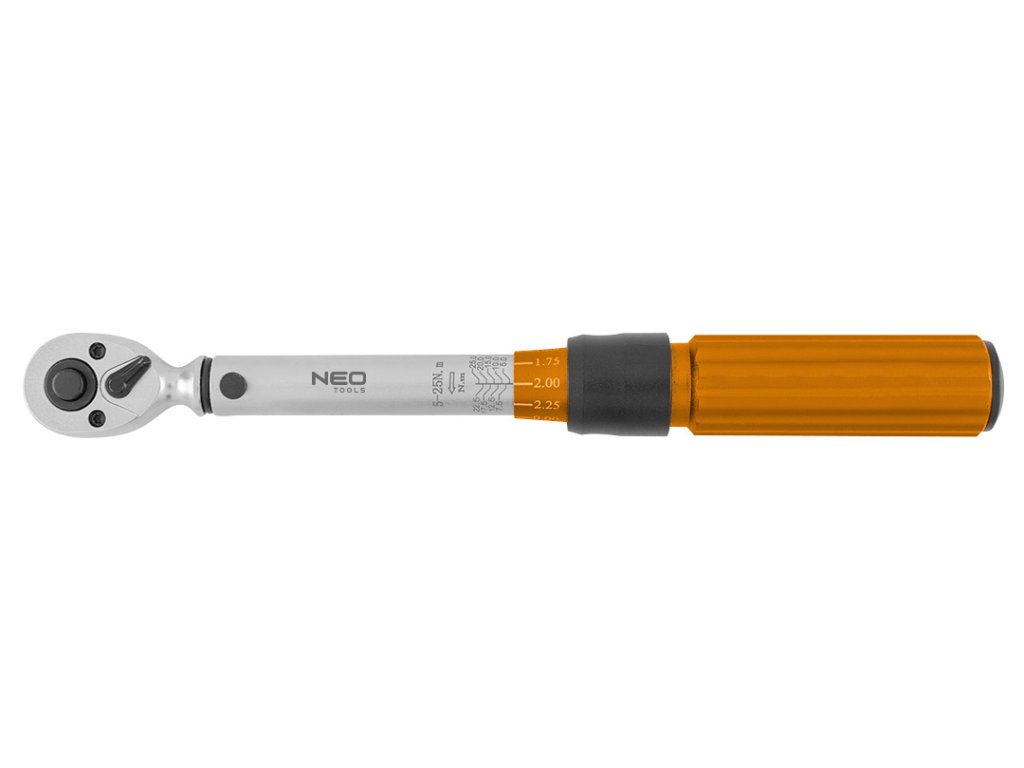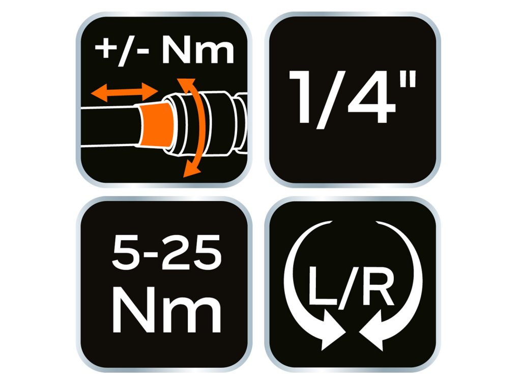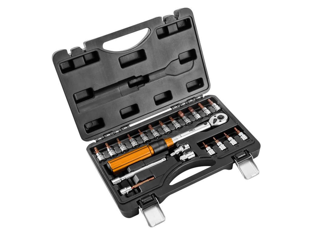 Oboustranný momentový klíč NEO (ref. 08-821) je sada sestávající z 21 prvků. Klíč o velikosti 1/4" a rozsahu 5 až 25 Nm má přepínač pro změnu směru, takže můžete šroubovat šrouby a matice s pravým nebo levým závitem. Je ideální pro všechny situace, kdy potřebujete přesně utáhnout šrouby s určitým točivým momentem. Sada obsahuje: momentový klíč, bity na 1/4" H5 x 100 mm, prodloužení 1/4" x 100 mm, adaptér 1/4" x 3/8", univerzální kloub 1/4".