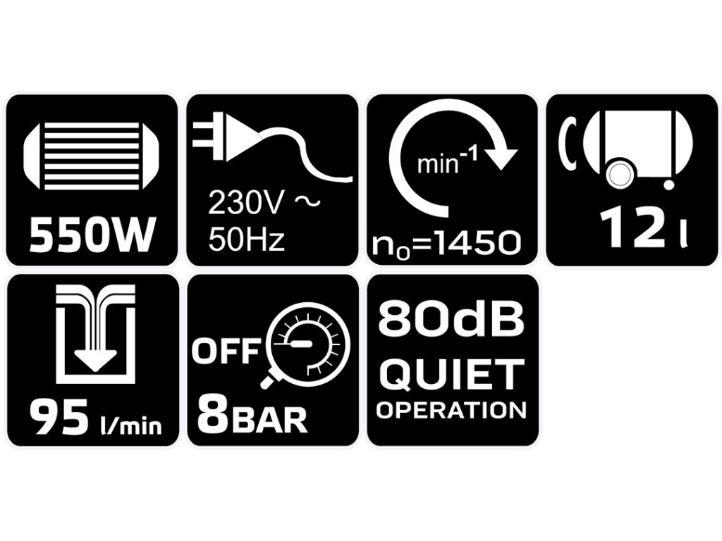 12litrový bezolejový kompresor 12K020-1 od společnosti NEO TOOLS je bezolejový kompresor s objemem 12 litrů, maximálním tlakem 8 barů a výkonem 550 W. Vyžaduje napájení 230 V/50 Hz. Vyznačuje se přívodem vzduchu 95 l/min a hlučností 65 dB. Bezolejový kompresor od společnosti NEO TOOLS má výkonný indukční motor a kulový vypouštěcí ventil. Doporučuje se do profesionálních dílen, kde je velmi důležitý snadný přístup ke konektorům, regulace tlaku a manometry, jakož i možnost pracovat s širokou škálou pneumatického nářadí – je velmi důležitý. Díky pohodlné rukojeti se snadno přenáší.