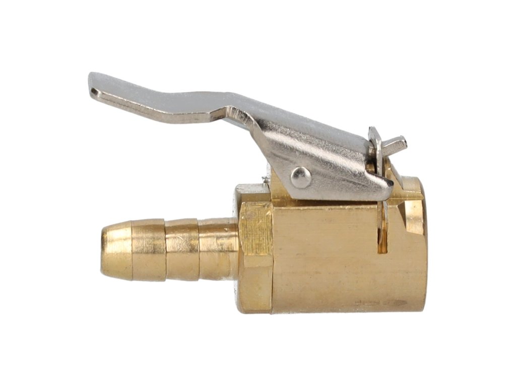 Material: Brass + Steel Clamp Type: Lever Clamp Tip Type: Open End (není dostupná automatická) Hose Size: 8 mm Thread Size: VG12 Maximum Pressure: 10 bar Operativní temperatura: -20°C až +60°C Application: Large-scale mech hose or tyre inflator