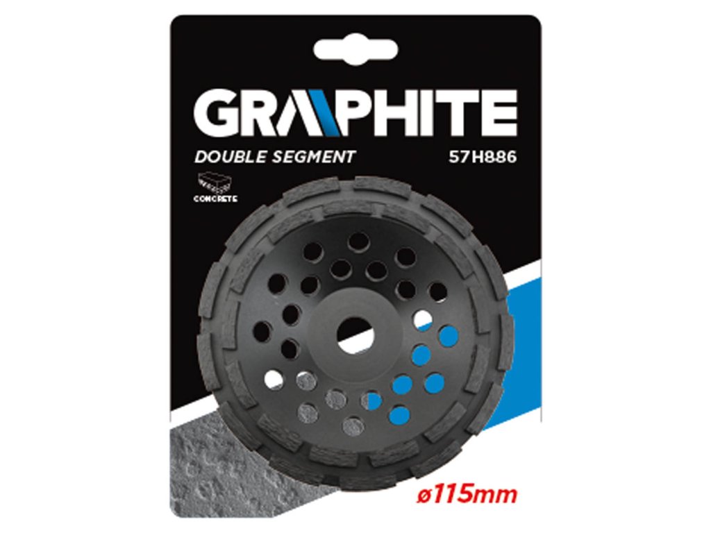 Brusný diamantový kotouč GRAPHITE určený k broušení ploch vyrobených z minerálních materiálů (beton, kámen, žula, mramor...). Dvojitý segment umožňuje účinně nahrubo brousit minerální podklady. Upevnění kotouče přizpůsobeno spolupráci s úhlovými bruskami.